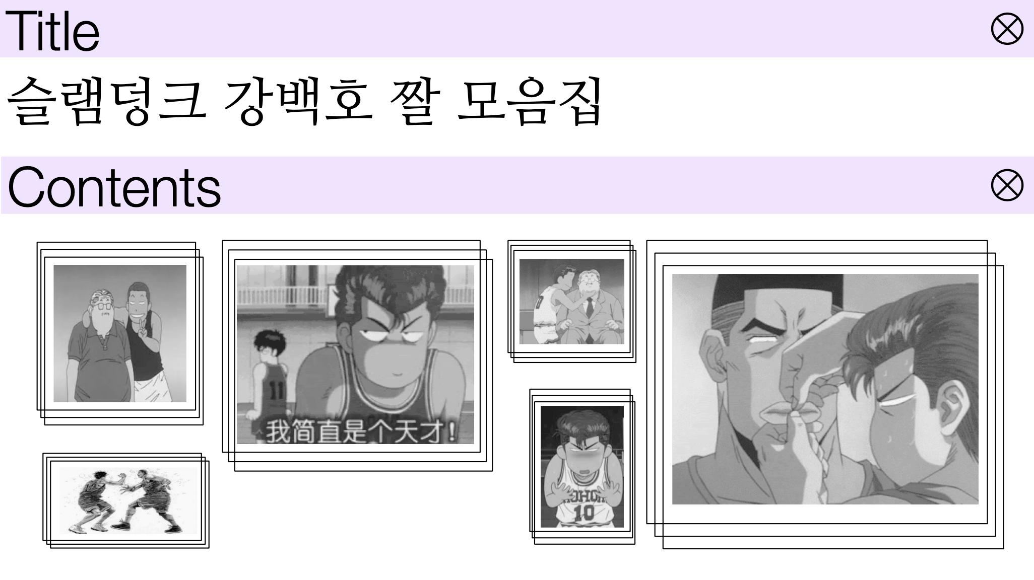 저는 예시로 슬램덩크 강백호의 짤을 인터넷으로 검색하여, 갤러리를 꾸며 보았습니다. 사진의 크기를 큰~것과 작은 것을 섞어서 넣어 주시면 훨씬 지루하지 않고 재미있는 슬라이드가 완성이 됩니다.