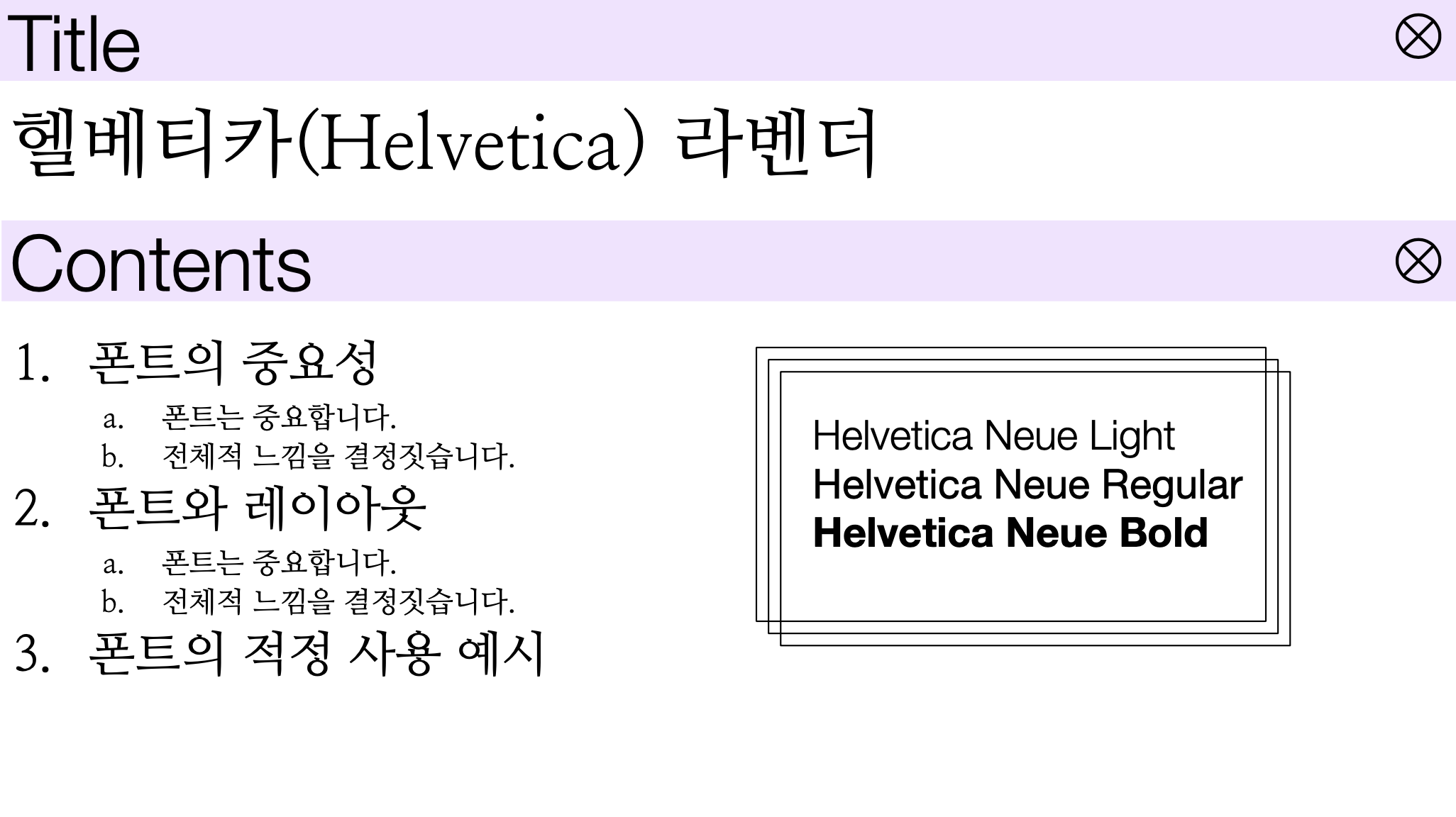 내용 슬라이드도 제목/내용 구분을 명확하게 해서 계층을 확실하게 해 주어 읽기 좋습니다. 저는 아래 예시로 폰트 관련 내용의 예시를 넣어 두었어요.