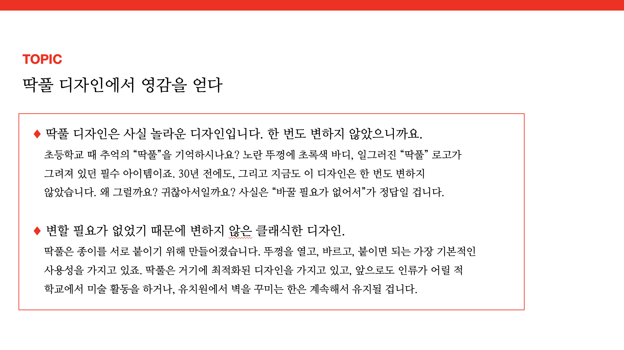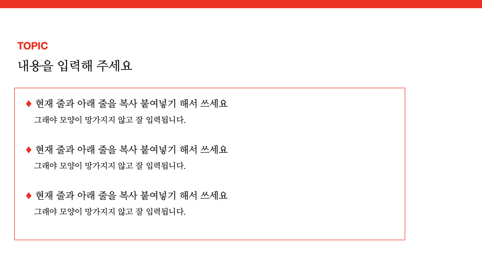 오늘은 가장 기본으로 쓰시기 좋은, 적당한 폰트 사이즈와 강조점을 가진 아주 심플하고 프로페셔널한 "심플한 레드 포인트" 구글슬라이드 양식을 디자인해 보았습니다. 이번 양식만큼은 개성강조, 감성, 포스트모던적인 느낌과는 달리 회사에서 보고서 쓸 때 사용하셔도 좋을만큼 체계가 잡혀 있고 전문적인 느낌을 줍니다.