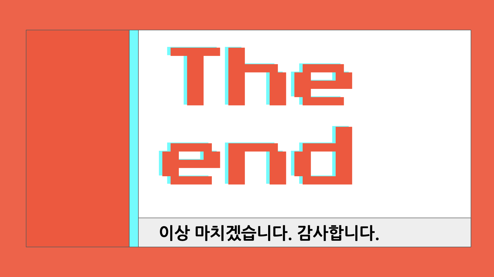 늘 말씀드리지만, 엇 이게 끝인가? 싶은 것보다는 끝임을 알리는 엔딩 슬라이드가 1장 있는 것이 발표든, 제출용이든 어떤 경우에든 훨씬 매끄럽고 유용합니다.