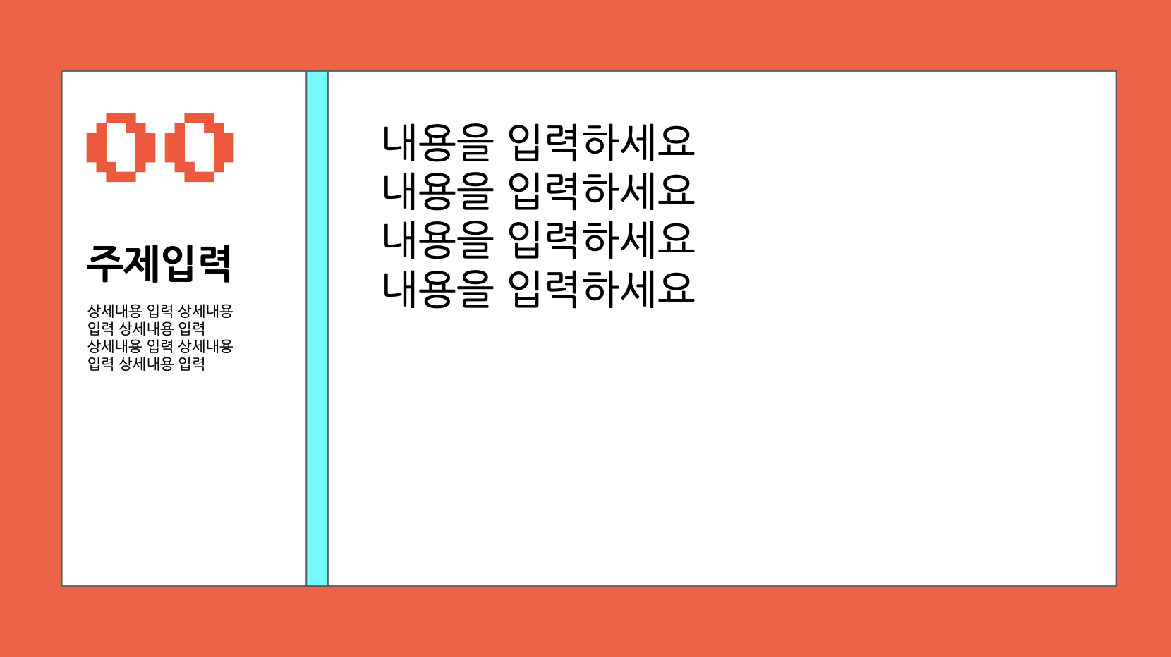 내용도 마찬가지로 가상으로 작성해서 넣은 예시 슬라이드를 넣었습니다. 큰 주제와 제목을 왼쪽에, 중심이 되는 내용을 오른쪽에 쓰기만 하면 되기 때문에, 직관적이고 사용하기 쉬운 구조입니다. 빨간색이라서 강렬한 느낌이 많이 드니까 너무 긴 내용보다는 짧고 굵게 가는 내용의 발표나 리포트에 잘 어울립니다.