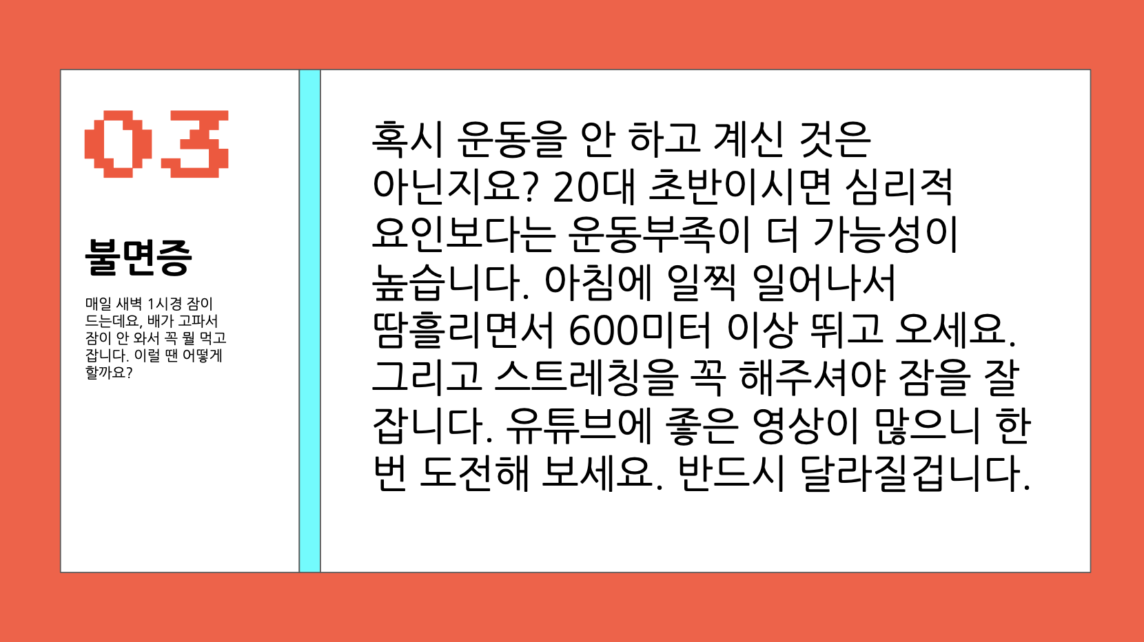 오늘은 지난번에 이어서, 구글슬라이드로 Q&A(질의응답) 형태의 고민상담 카드 PPT 템플릿을 만들어 보았습니다. 이번에는 빨간색으로 톡톡 튀게 만들어 보았습니다. 귀여운 느낌, 젊은 청년/청소년 감성, 톡톡 튀는 강렬한 느낌이 나기 때문에, 이런 디자인의 특성을 잘 살려서 발표 성격에 맞춰 사용해주세요.