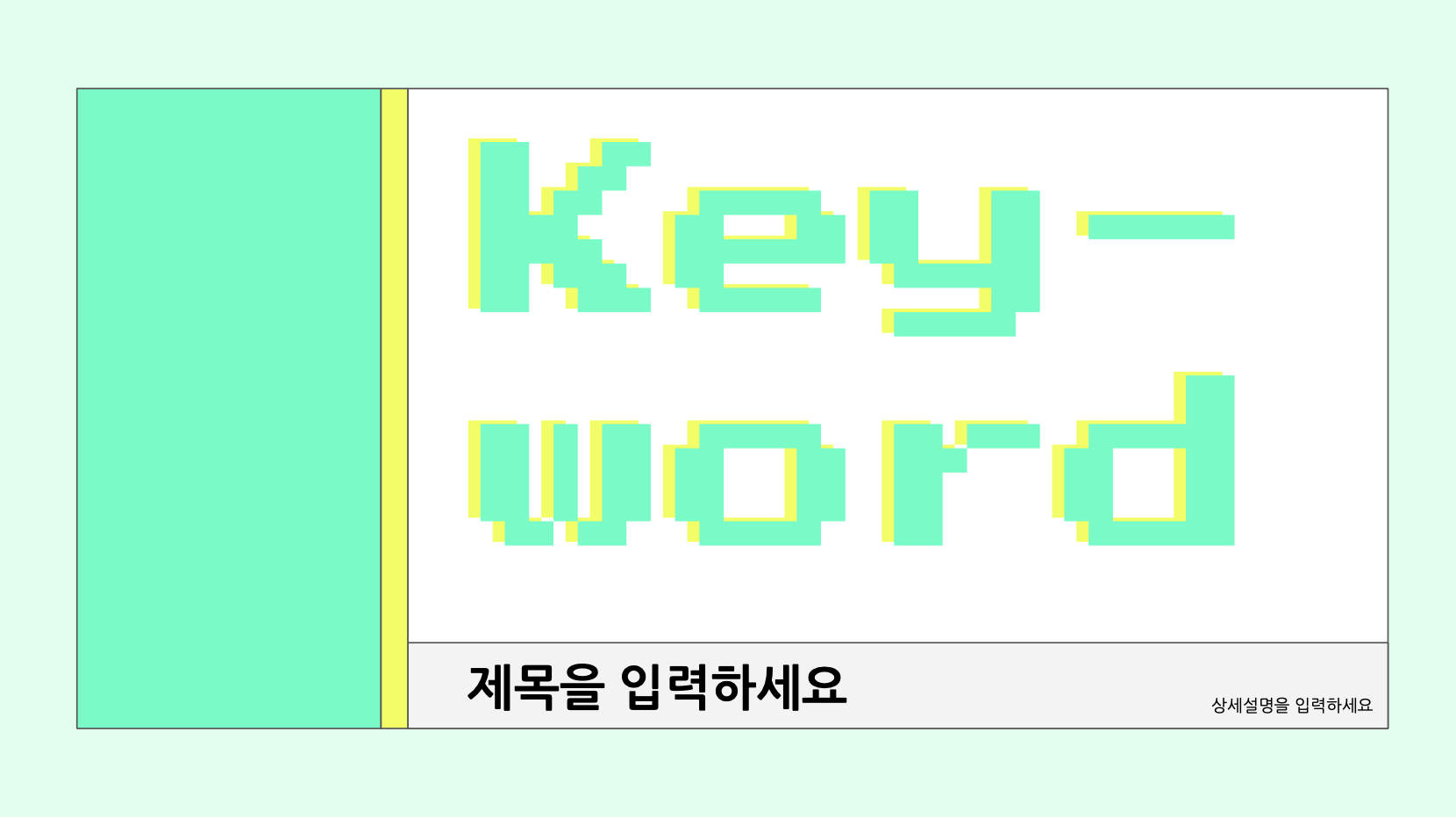 이번 색조합은 정말 시원하고 시원해서 차가운 느낌이 확! 들 정도입니다. 굉장히 발랄하고, 명랑한 느낌을 주는 옐로그린과 민트색(형광 청록색이라고 봐도 되겠죠)의 조합입니다. 아래는 제가 임의로 입력해 둔 제목 샘플입니다. 이런 식으로 본인이 말하고자 하는 내용에서 영어로 된 키워드를 확! 강조해주기 좋은 디자인입니다.