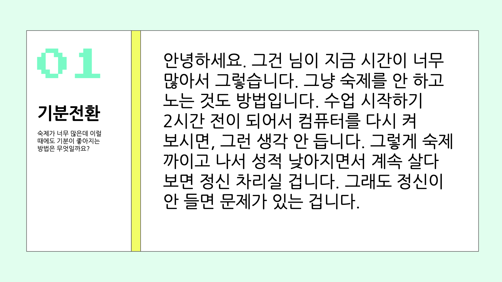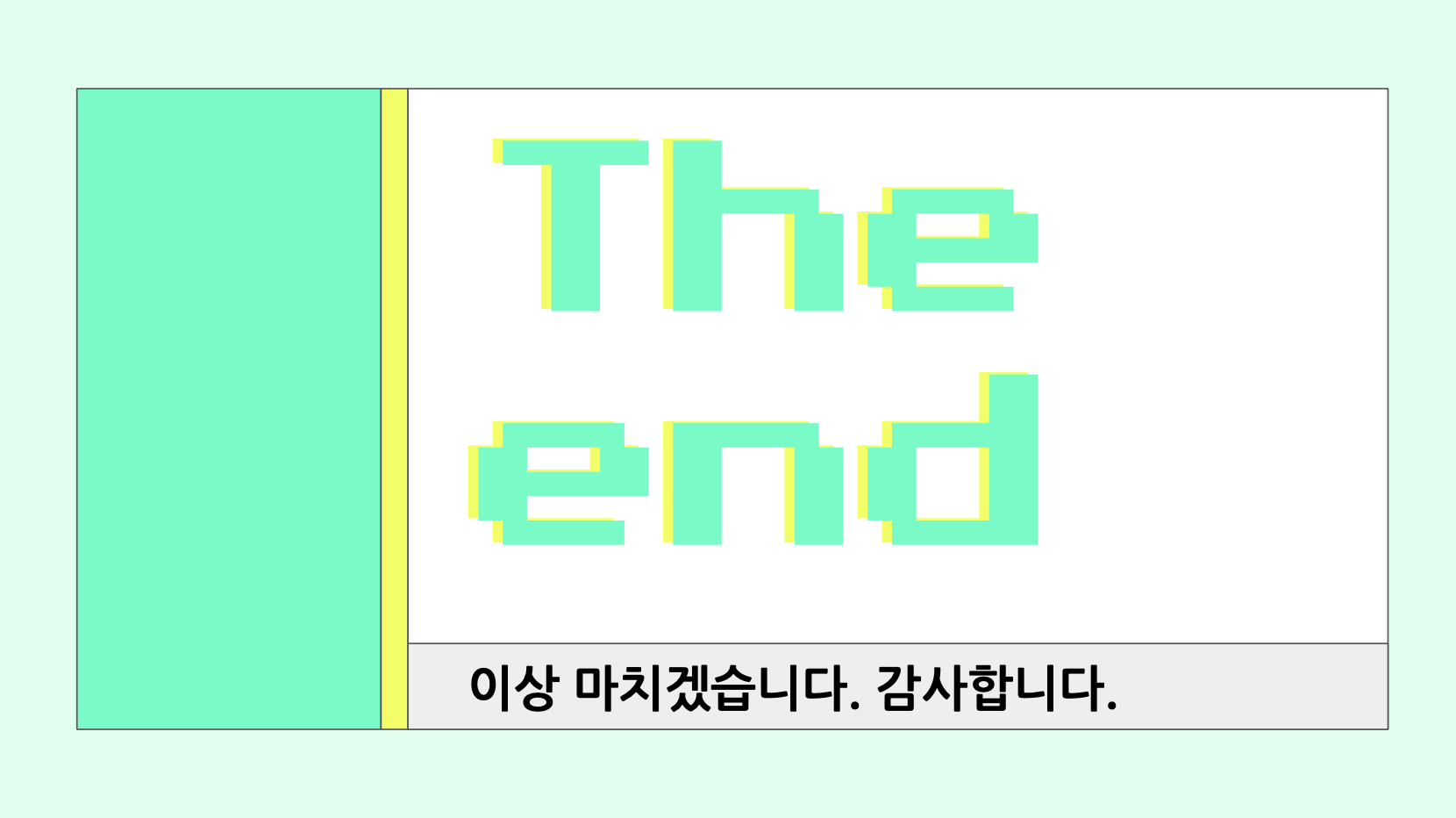 이렇게 시원한 아이스 민트, 사이다 느낌의 파워포인트로써 이번 시리즈도 마무리합니다. 어떠셨나요? 혹시 다른 컬러를 찾고 계시다면 제 블로그 내에 3가지의 다른 색상도 있으니, 잘 찾아서 활용해주세요.