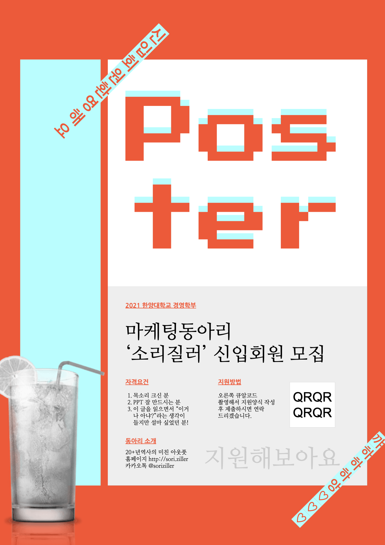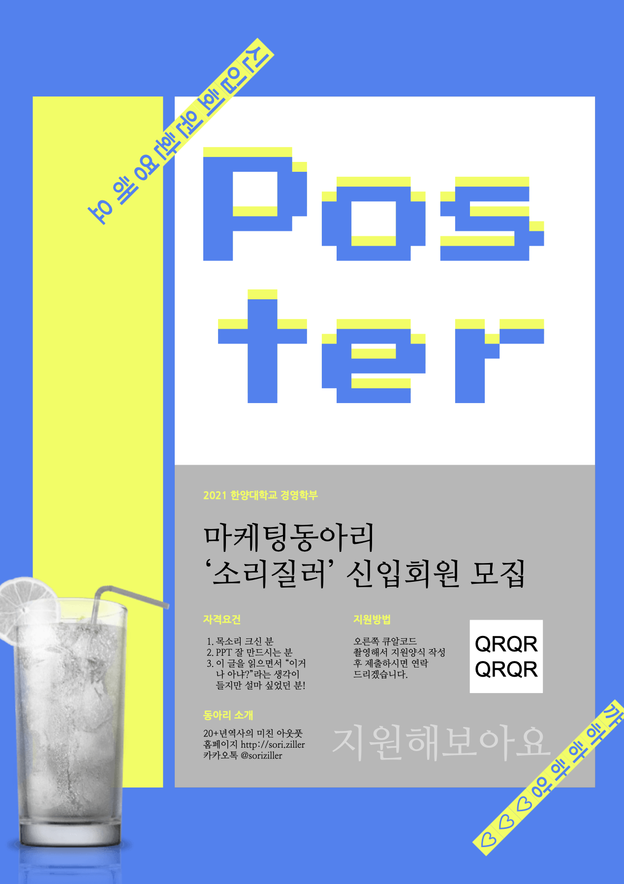 Pos ter 마케팅동아리 ‘소리질러’ 신입회원 모집 Pos ter 자격요건 지원방법 2021 한양대학교 경영학부 목소리 크신 분 PPT 잘 만드시는 분 이 글을 읽으면서 “이거 나 아냐?”라는 생각이 들지만