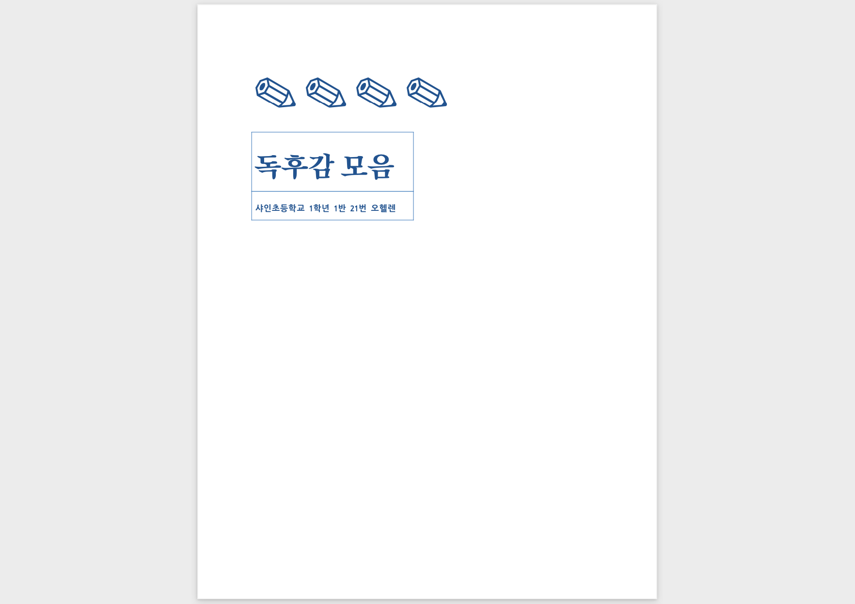 먼저 제목 페이지에 이름을 써 주시면 되는데요, 웬만하면 제목 페이지는 많이 수정하지 않으시는 것이 좋아요! 어쩌다 잘못 누르면 첫 번째 페이지가 사라질 수 있습니다.