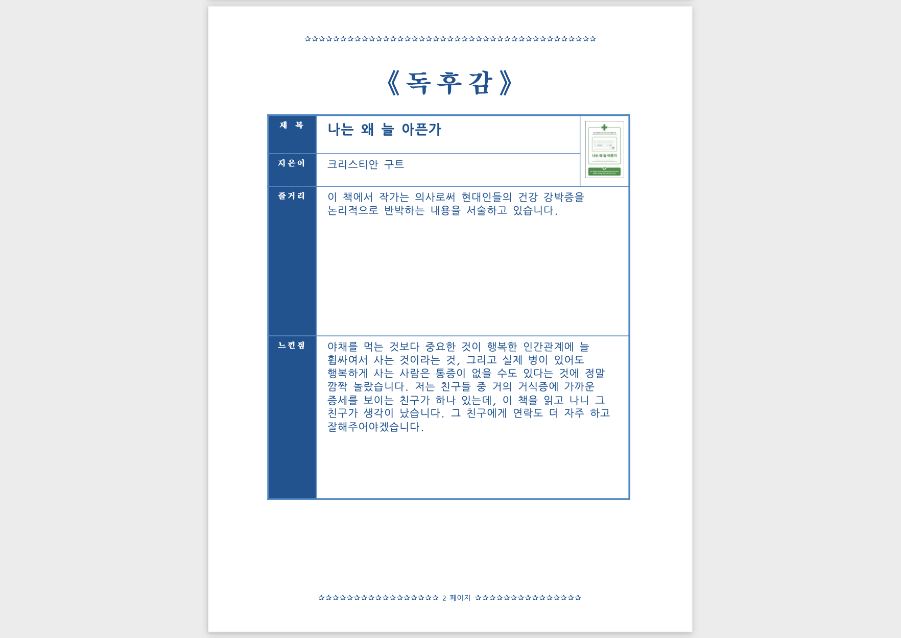 ✎✎✎✎ 독후감 모음 샤인초등학교 1학년 1반 21번 오헬렌 《 독 후 감 》 제 목 나는 왜 늘 아픈가 지 은 이 크리스티안 구트 줄 거 리 이 책에서 작가는 의사로써 현대인들의 건강 강박증을 논