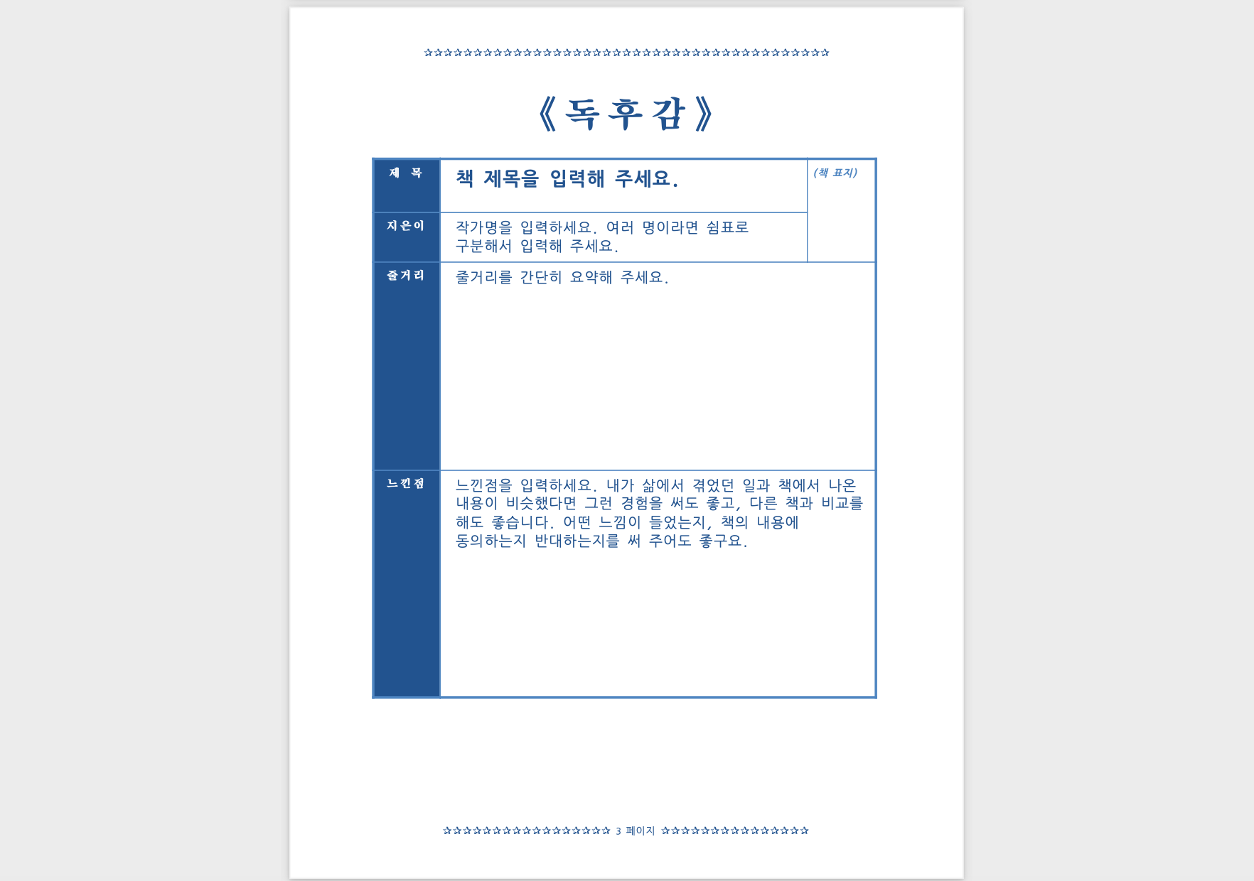 이번 독후감 템플릿은 제가 어렸을 때 학교에서 숙제로 받았던 독후감 양식과 가장 비슷하게 디자인해 보았습니다. 흰 배경에 깔끔한 군청색으로, 표 형태로 디자인해 보았습니다. 어떤 내용을 어디에 써야 할 지가 굉장히 명확해서 사용하기 쉽습니다. 여기에 독후감을 써서 제출해보세요. 아주 깔끔하게 독후감을 정리할 수 있습니다.
