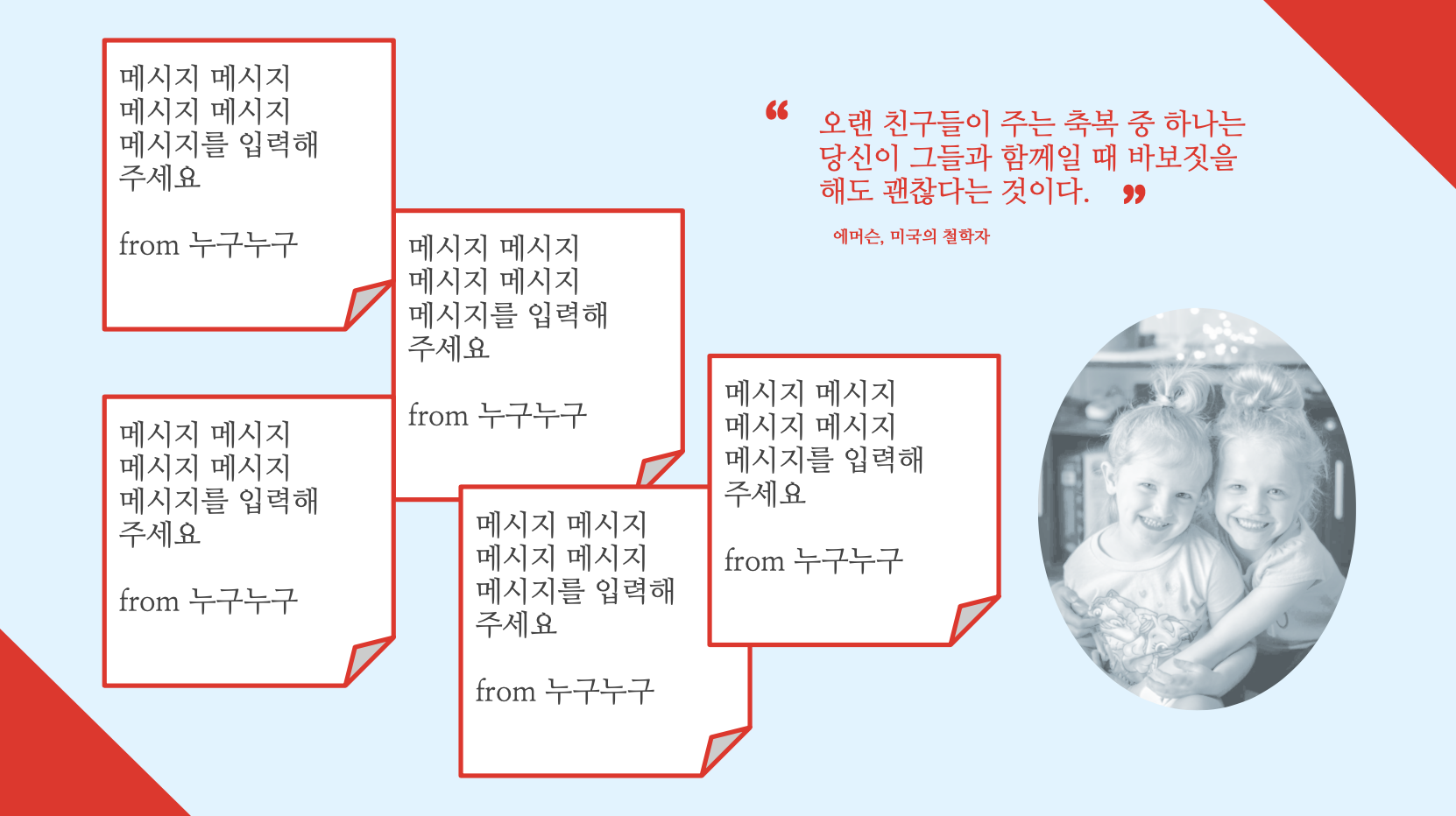 우정이란 건 정말 소중하고, 좋은 것 같아요. 스카이블루 레드 온라인 롤링페이퍼 양식과 함께 반 친구, 모임에서 만난 친구들과 우정을 나누고 마음을 전달해 주는 소중한 시간 가지시기를 바랄게요.