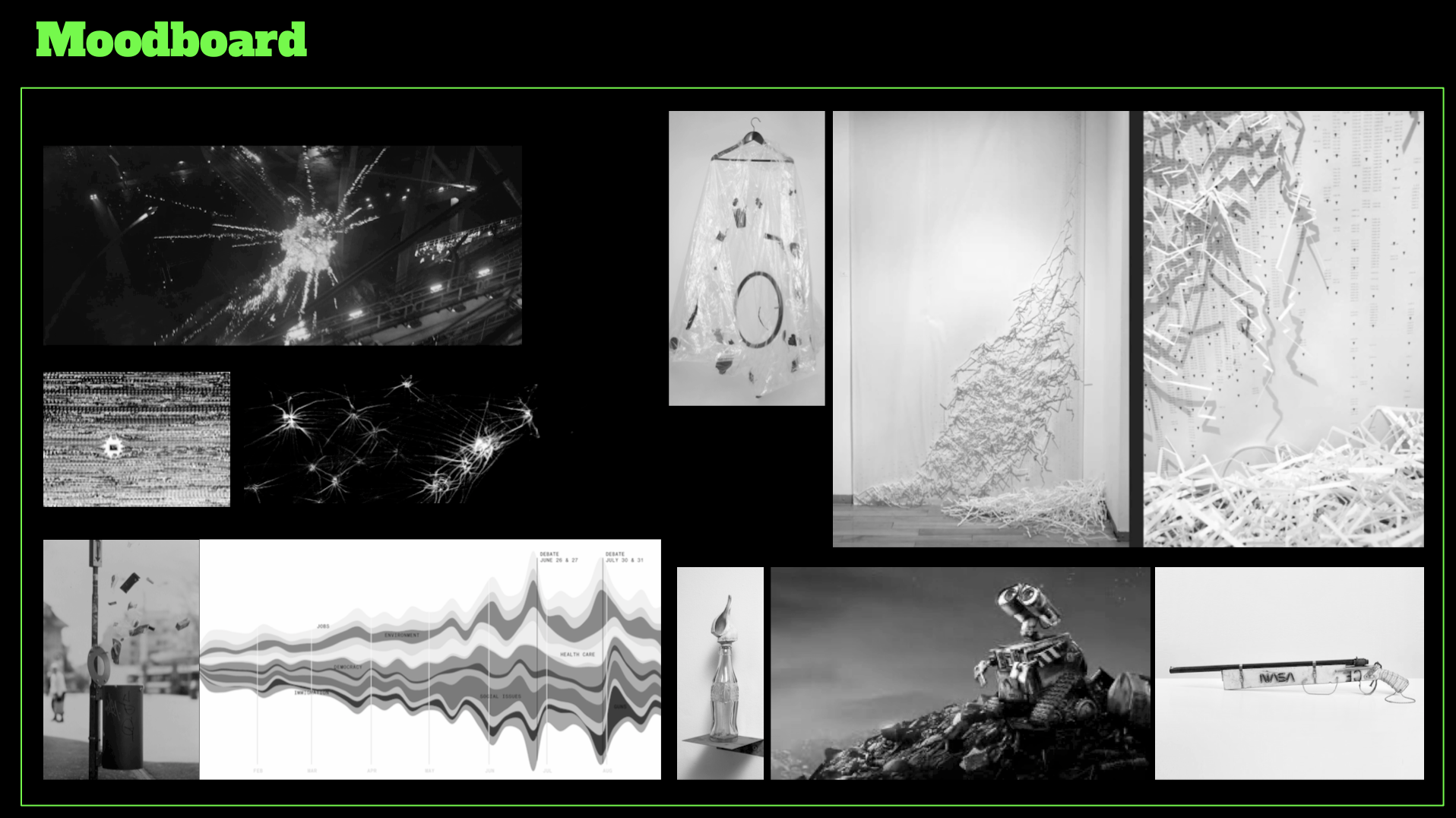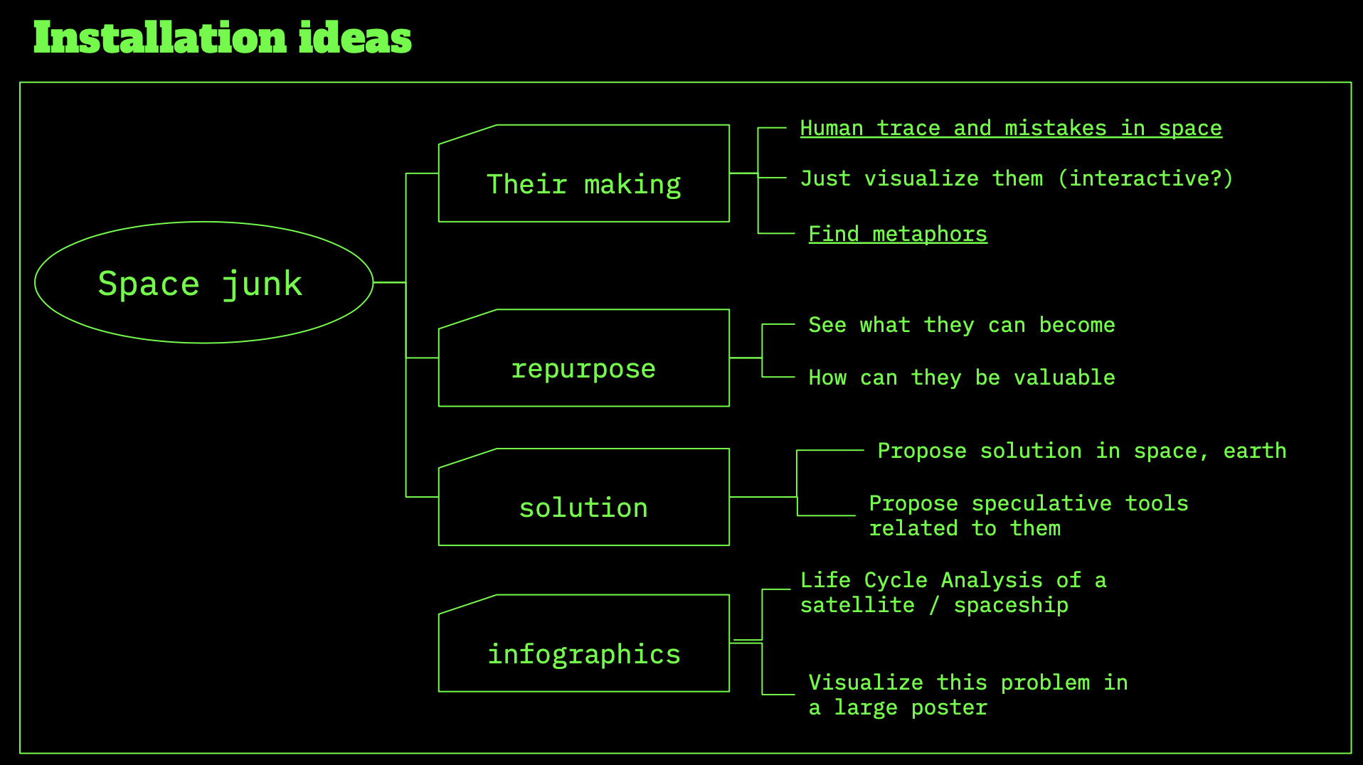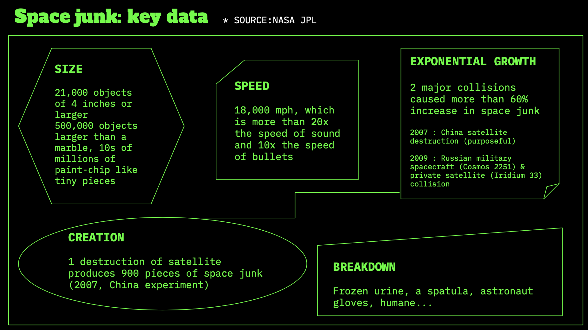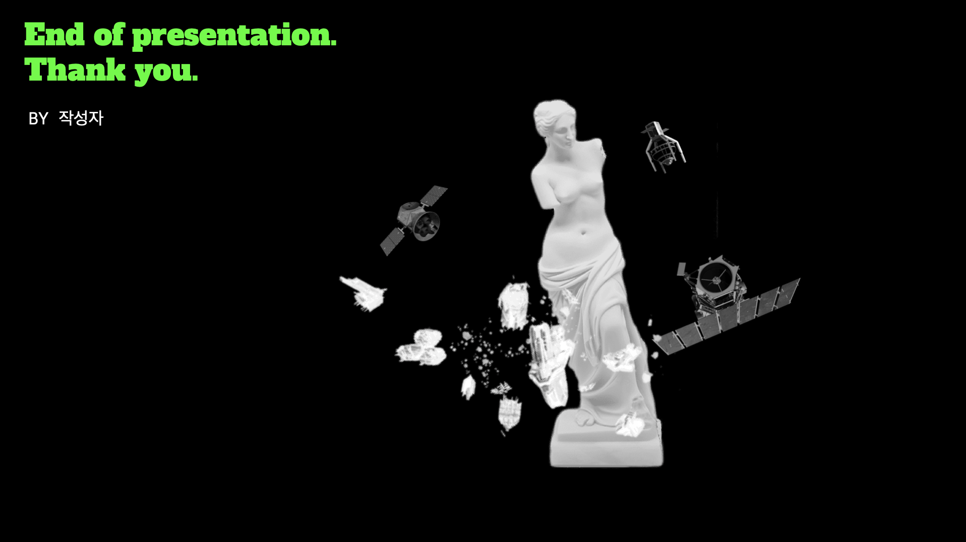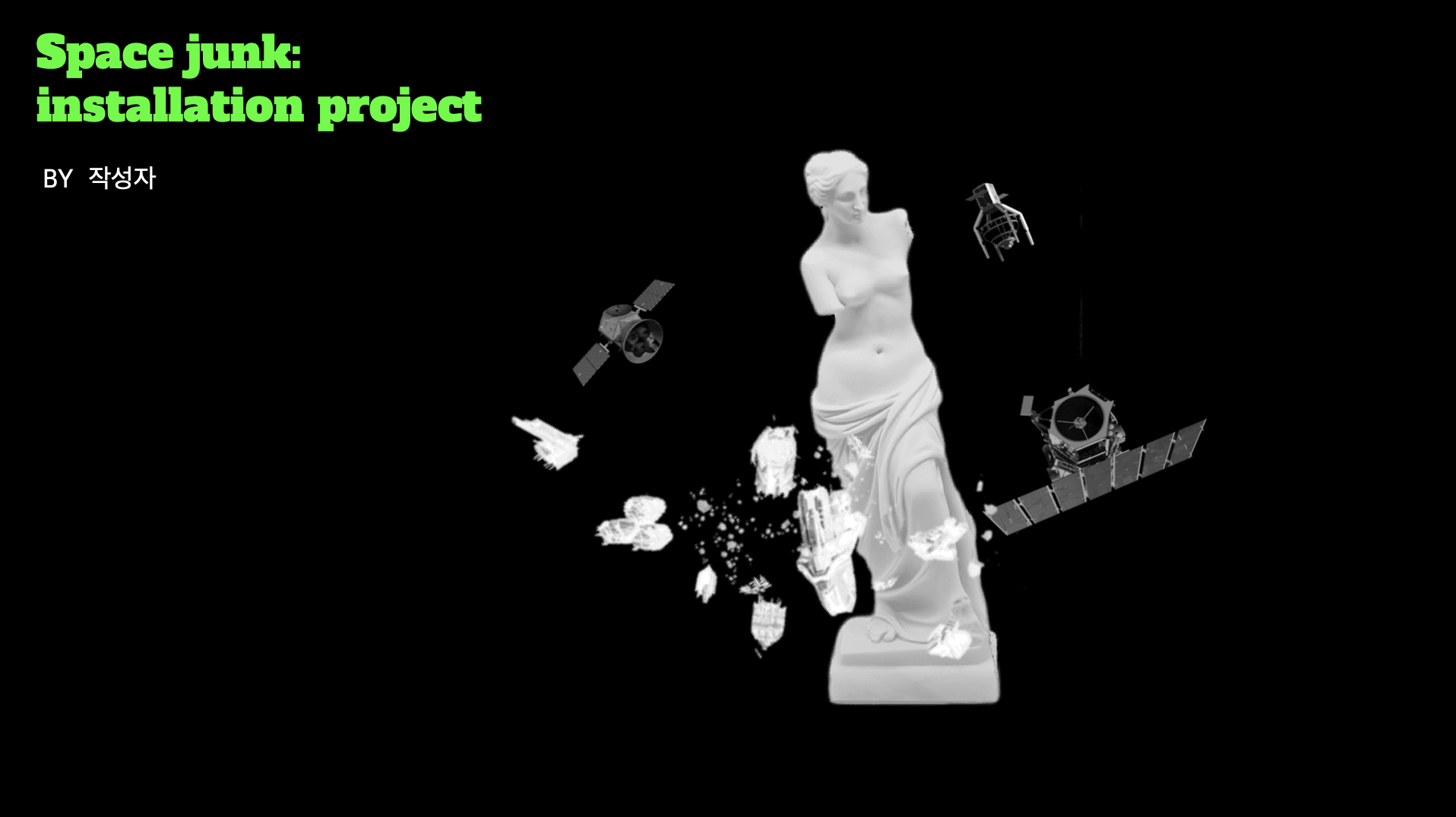 진한 검정색 배경에 형광 그린컬러로 제목을 달아주었습니다. 소제목이나 부가적인 정보는 작은 흰색폰트로 처리해 두었습니다. 원래 제가 우주쓰레기 관련 발표를 할 때 썼던 장표입니다.