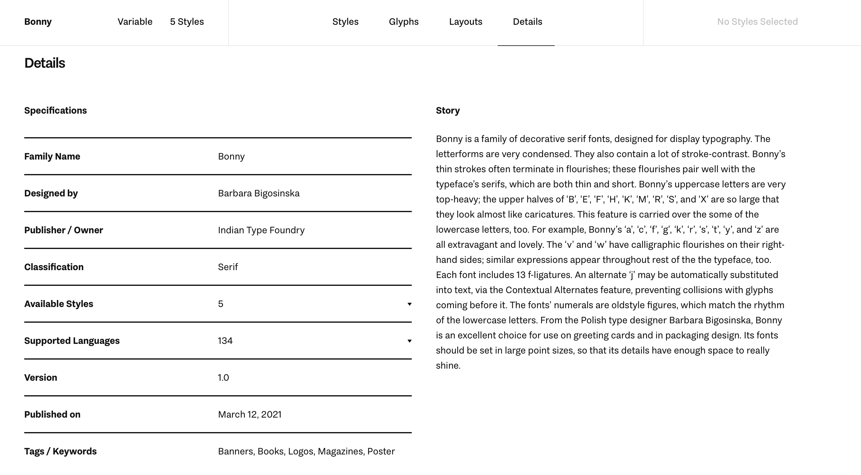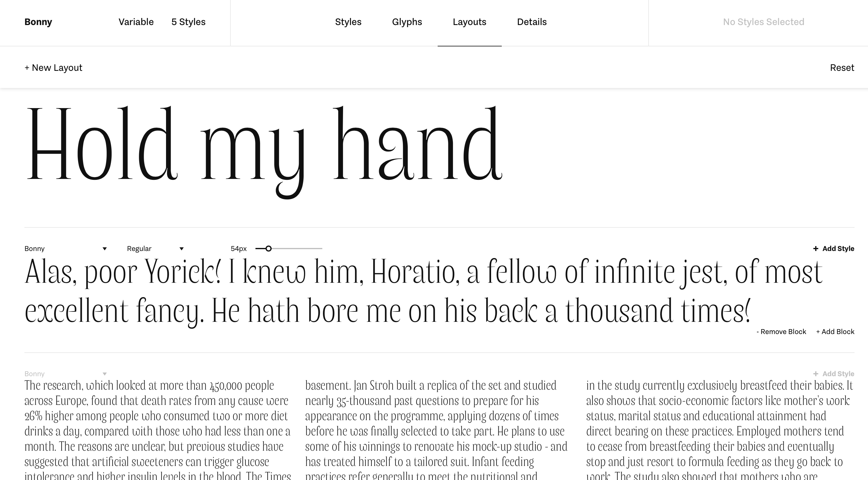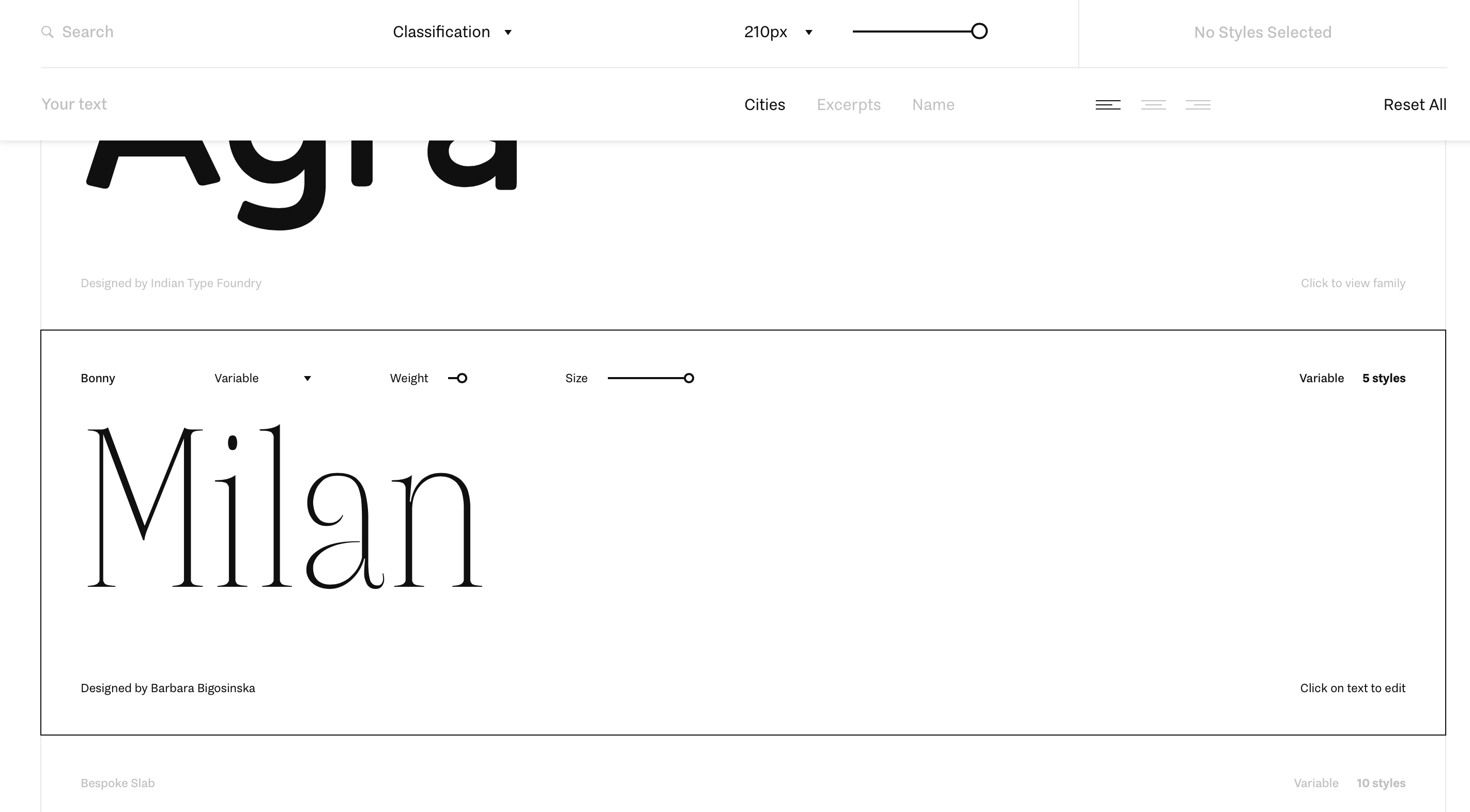과연 전문가 집단이 만든 무료폰트 플랫폼답게, 정말 상세하게 글꼴을 살펴보고, 여러가지 사이즈와 레이아웃으로 테스트해볼 수 있는 기능도 지원합니다. 아래 "Milan"이라고 나와있는 "Bonny"라는 폰트가 있습니다.