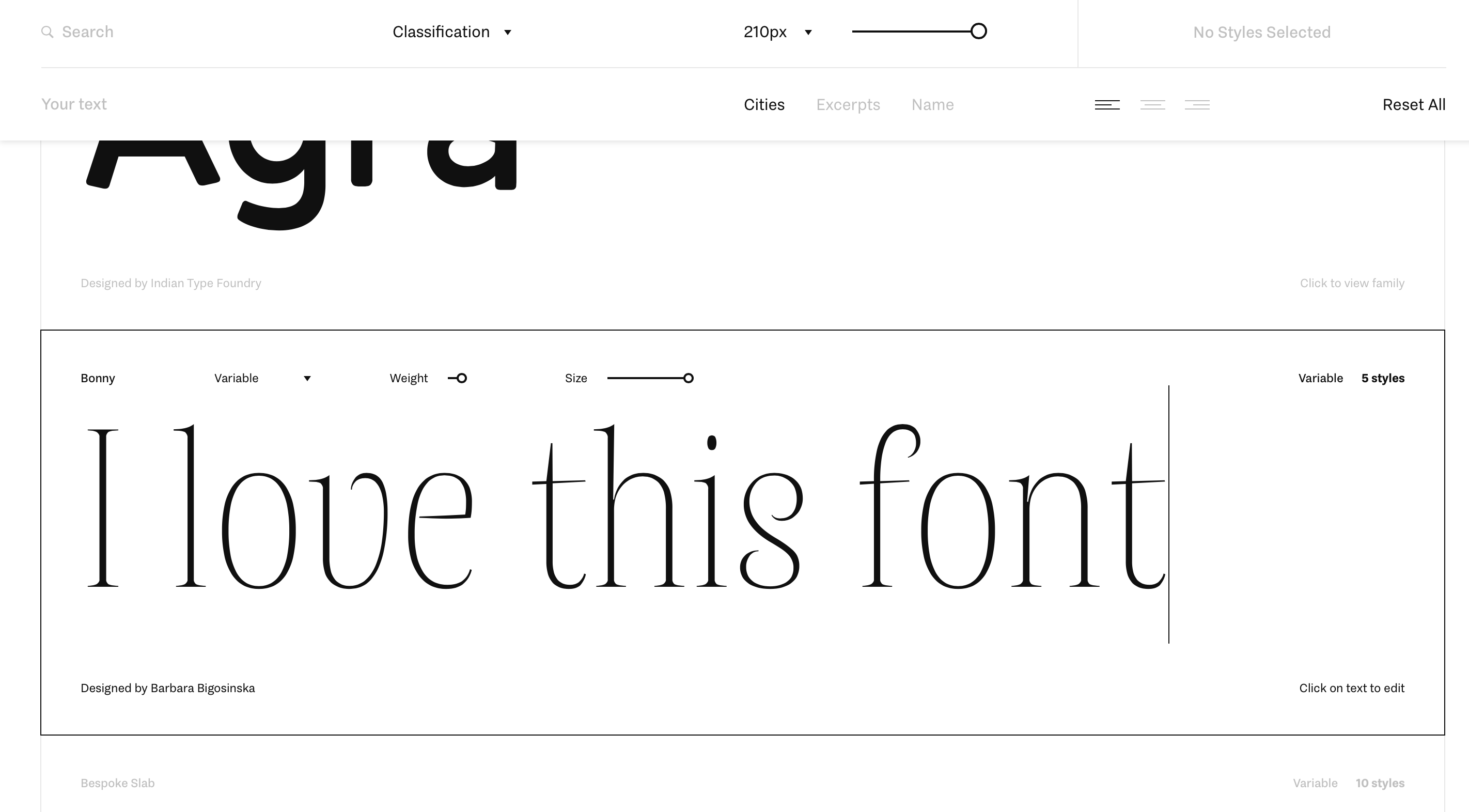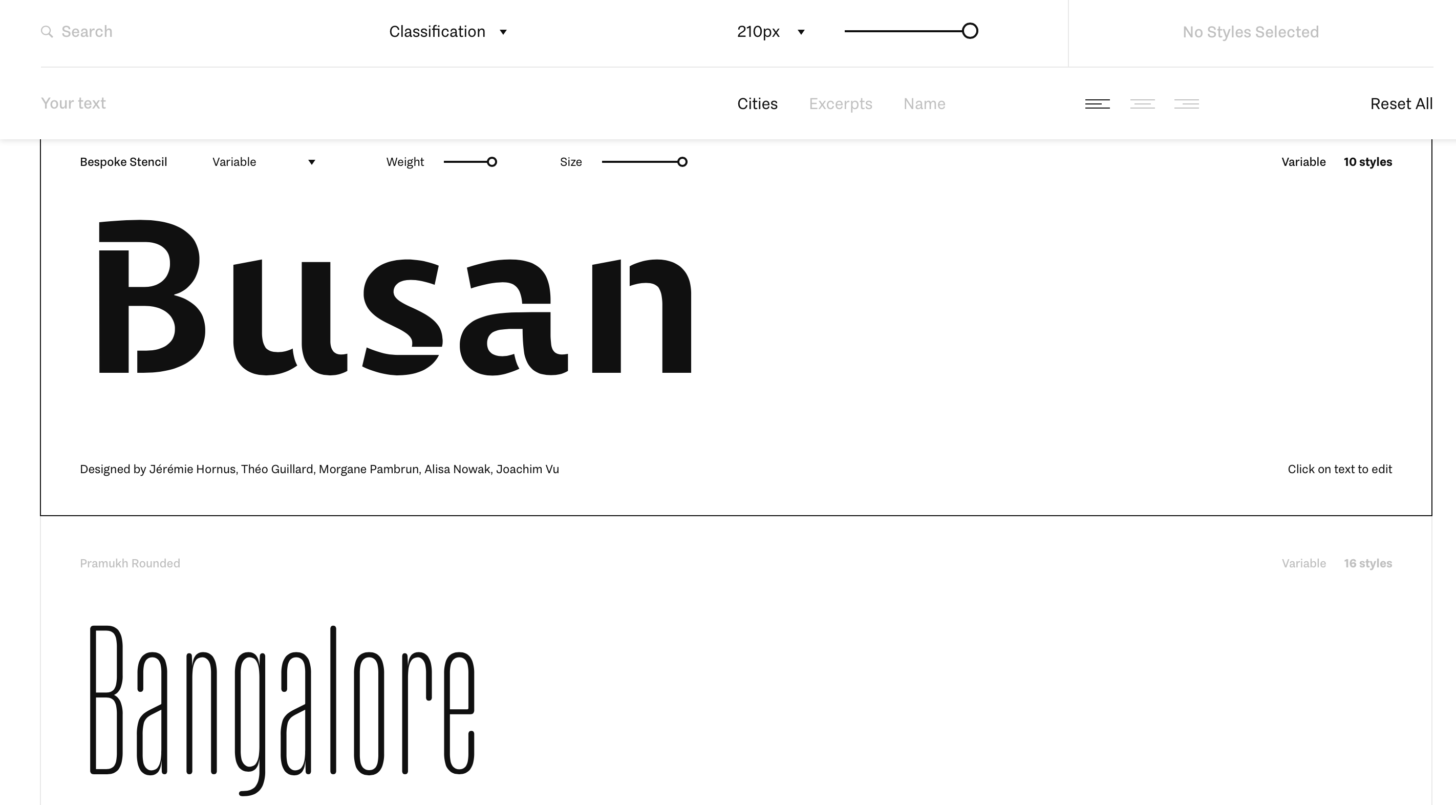보시면 산세리프(sans-serif), 세리프(serif), 디스플레이(display) 타입 등 다양한 종류의 글씨체들이 있습니다. 세계 각지의 도시 이름으로 표시를 해 놓아서 처음 보시는 분들은 저게 폰트 이름인 줄 알고 헷갈리실 수 있을텐데요, 실제 폰트 이름은 왼쪽 위에 나와 있습니다.