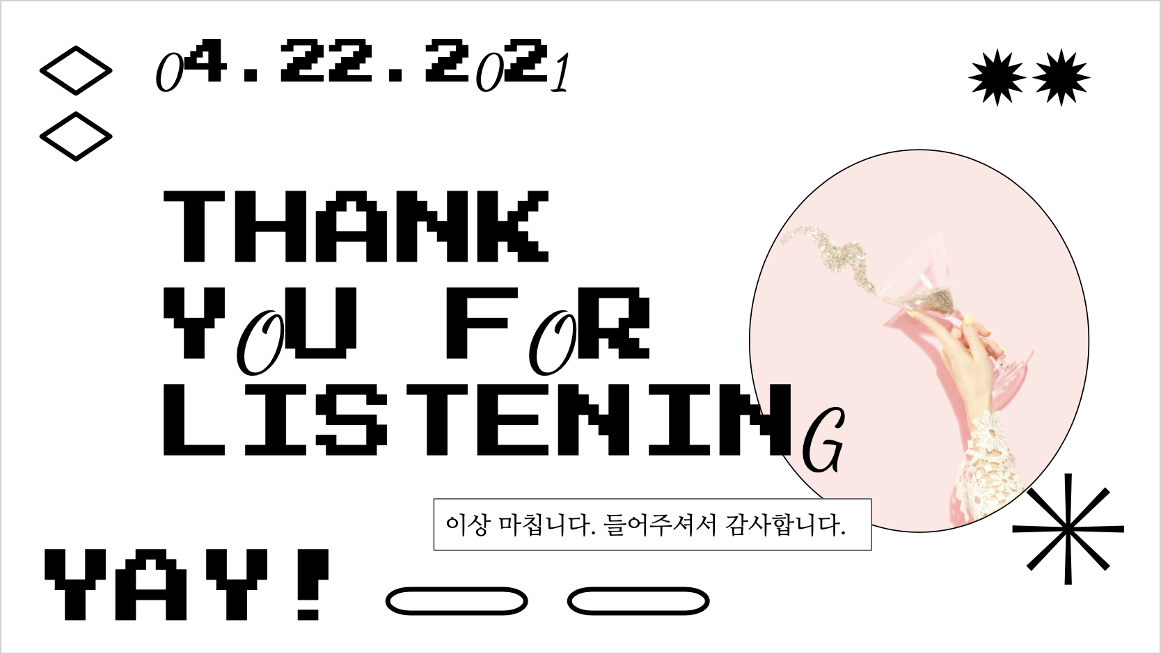 마지막 슬라이드는 파티느낌으로 꾸며 보았습니다. 얼마든지 본인이 원하는 사진과 텍스트로 바꾸어 넣으셔도 좋습니다.