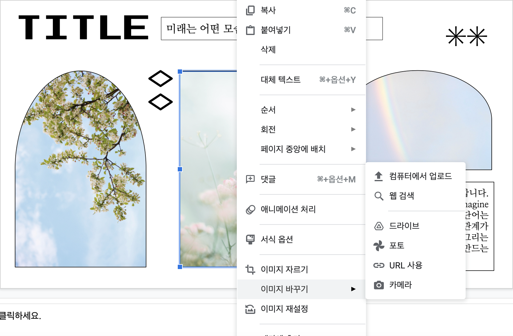 그림을 오른쪽 클릭하신 후에, "이미지 바꾸기"를 선택하시면 자신의 이미지로 바꾸어 넣으실 수 있습니다. 사이즈와 모양 및 위치가 그대로 유지되면서 그림만 자신이 선택한 그림으로 넣어진답니다.