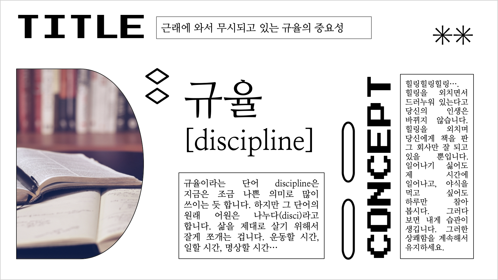 깔끔한 흰색 배경에 playful 한 글씨체를 섞어서 넣어주고, 특수문자로 꾸며 주었습니다. 사진과 텍스트 둘 다를 강조할 수 있습니다. 처음 제목 슬라이드는 조금 그래도 공간이 있는 편인데, 내용 슬라이드들은 조금 꽉꽉 채워져 있죠?