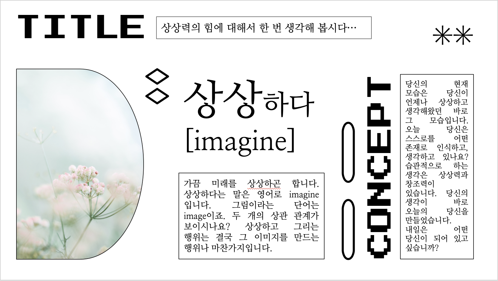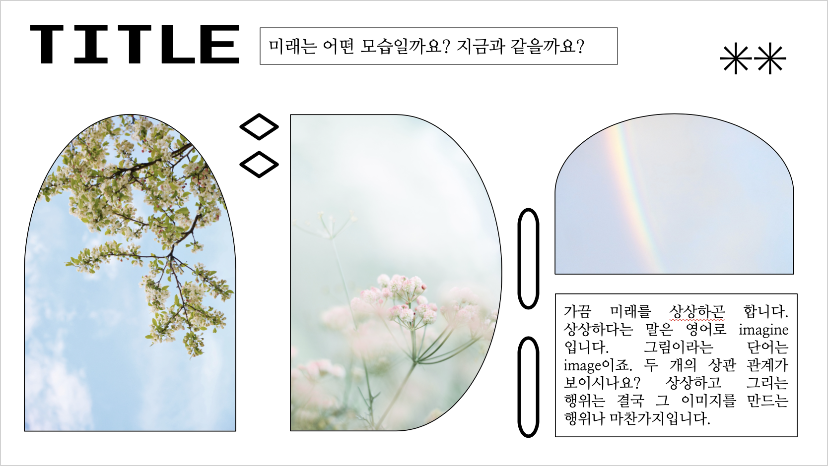다른 슬라이드들은 마찬가지로 슬라이드 중앙에 중심이 되는 내용을 넣고, 다른 부분들에 텍스트와 그림을 넣을 수 있도록 구성해보았습니다. 다소 빽빽하게 느껴지신다면 별표나 글자를 지우셔도 괜찮습니다. 자유롭게 꾸며 보세요.