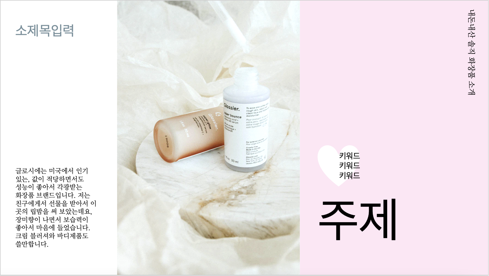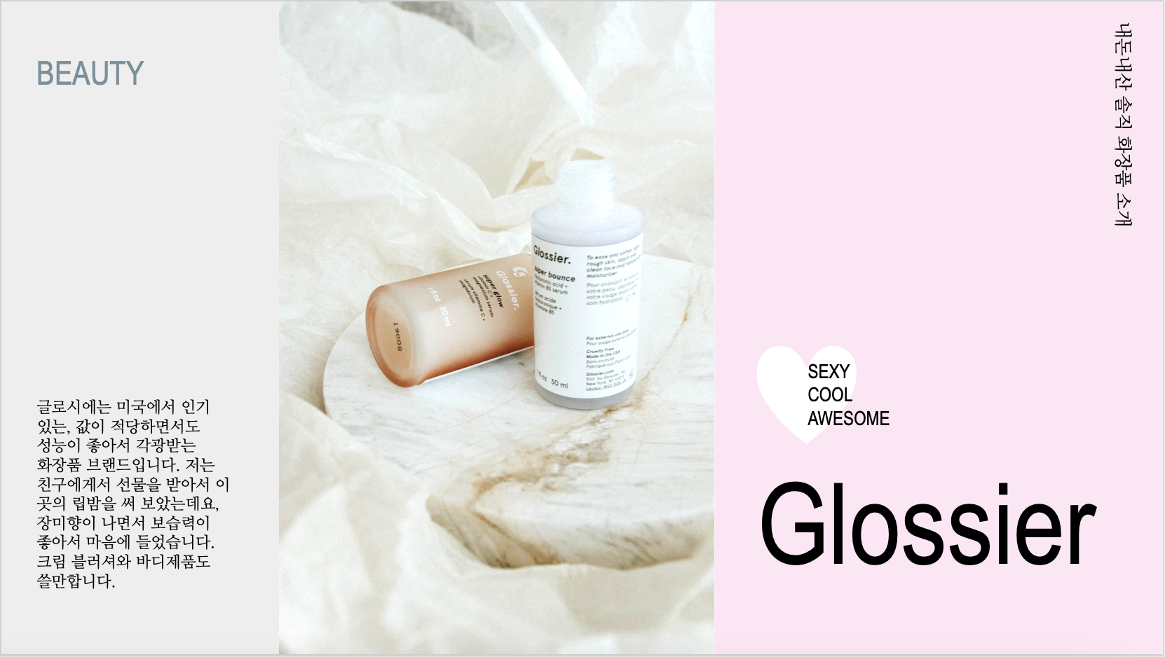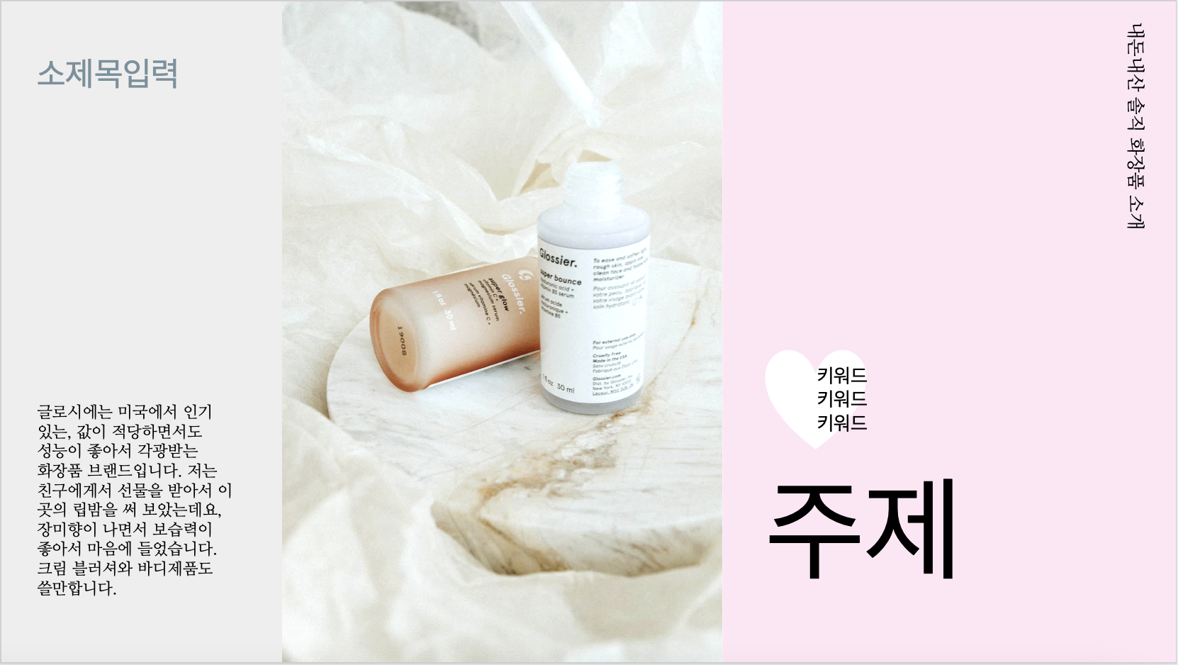 흰색 배경에 핑크색 블록을 주고 텍스트를 넣을 수 있는 공간을 많이 만들어 두었습니다. 저는 예시로 글로시에(Glossier)라는 브랜드 사진과 함께 소개를 실어 놓았는데요, 복사 > 붙여넣기를 이용해서 계속해서 같은 레이아웃으로 쓰실 수 있습니다. 조금 더 얌전하고 톤 다운된 느낌을 원하시면 그레이 컬러 버전도 포함시켜 두었으니 골라서 사용하시면 될 것 같습니다.