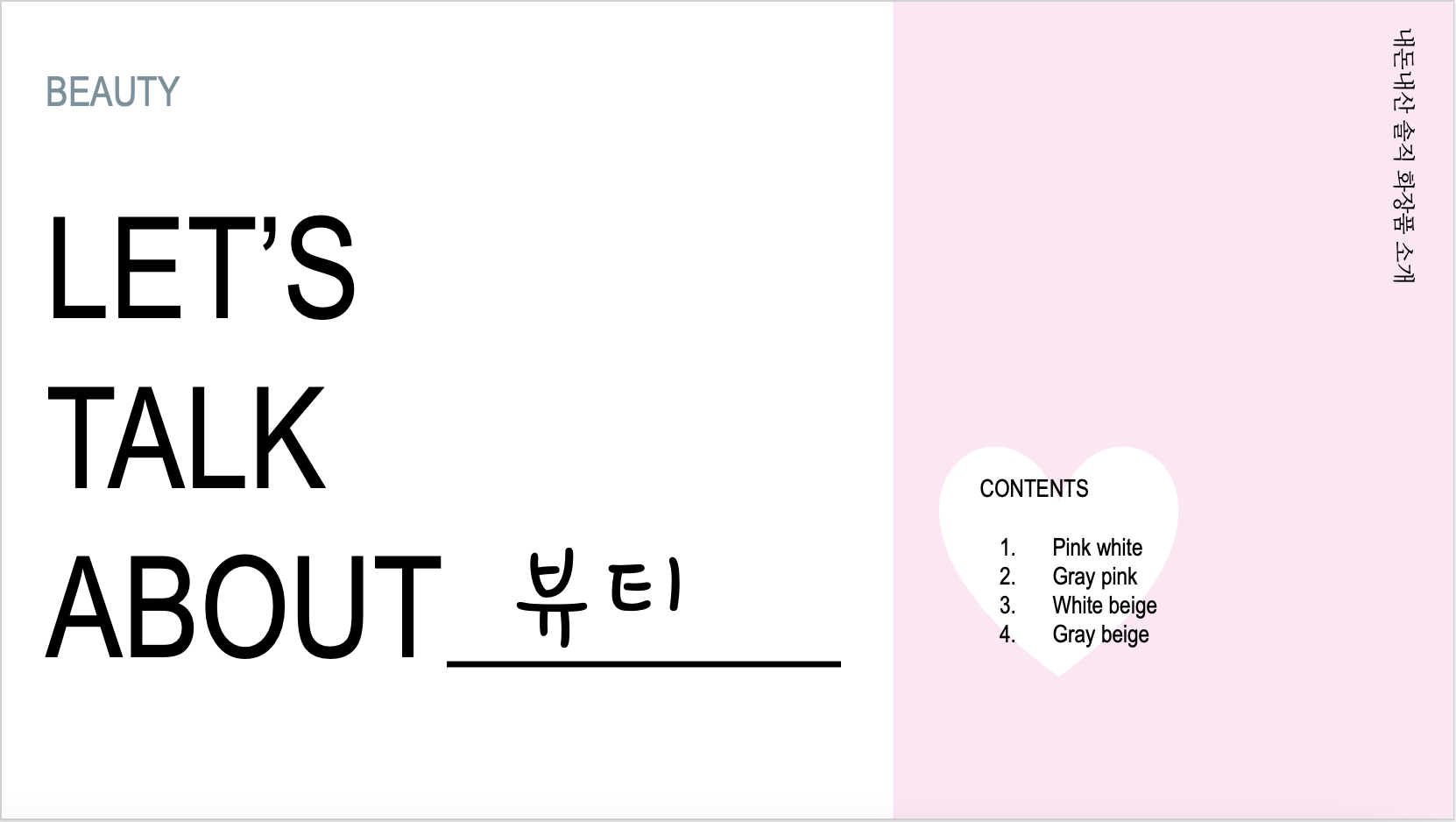 내돈내산 솔직 화장품 소개 LET’S TALK ABOUT BEAUTY 뷰티 CONTENTS Pink white Gray pink White beige Gray beige