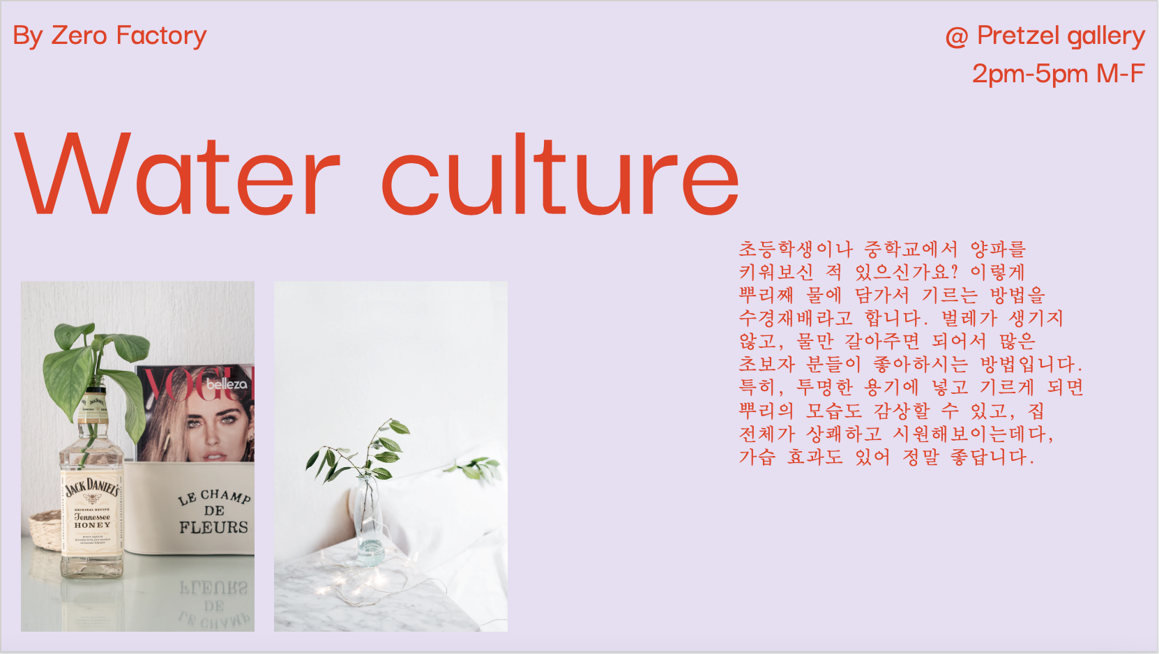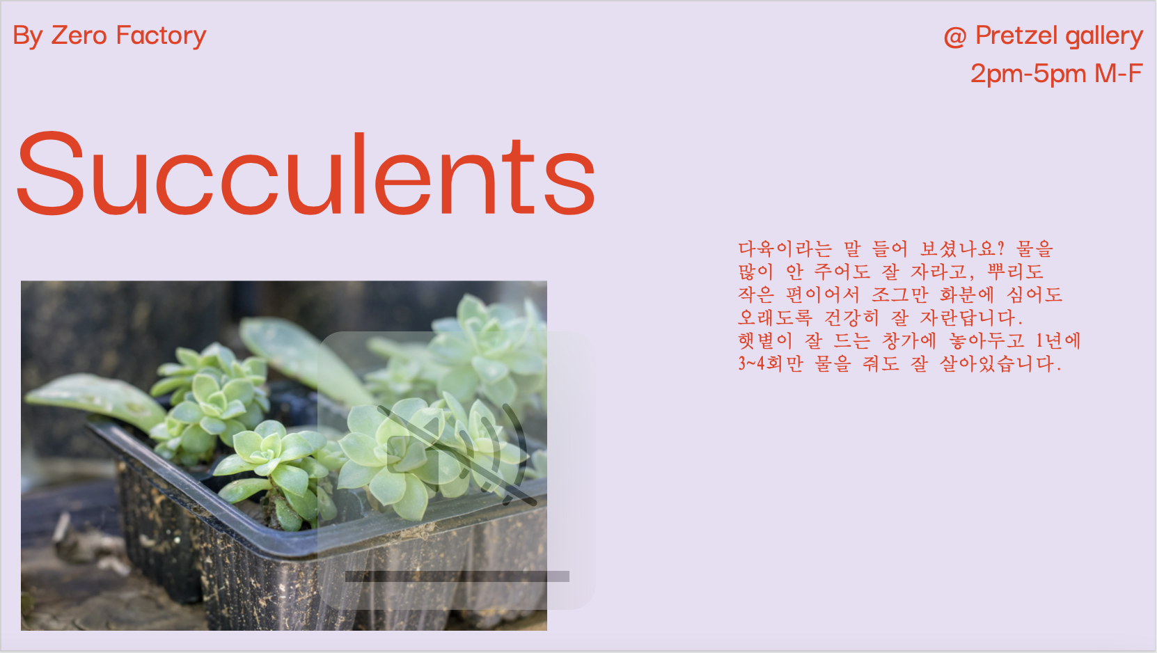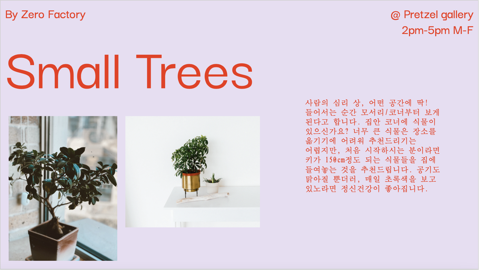 톤다운된 연보라 배경에 오렌지빛 레드 레터링을 배치해 주었습니다. 세부사항은 조금 더 작은 글씨로 상단에 반복적으로 활용하실 수 있게 계속해서 같은 위치에 놓았습니다. 제목, 사진, 텍스트 모두 같은 위치에 두어서 보는 사람으로 하여금 안정되고 정돈된 느낌을 줍니다.