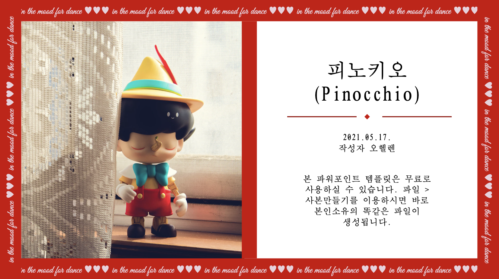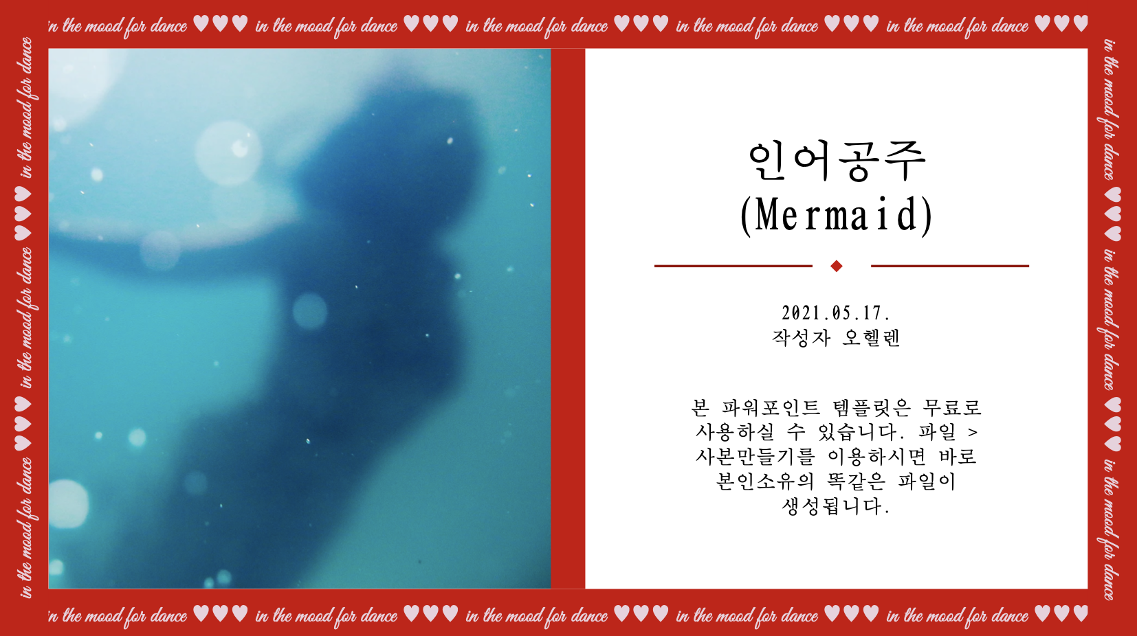 스크립트 글자체로 분홍색 텍스트를 넣어 (In the mood for dance, 하트) 테이프처럼 테두리에 붙여주었고, 감성적인 느낌을 극대화할 수 있도록 복고풍의 PC 명조체를 활용했습니다. 텍스트를 많이 넣을 수는 없으나, 그림과 메시지를 강조하시기에 좋습니다. 매우 감성적인 빈티지 느낌이 나기 때문에, 다이어리, 책자 만들기, 스크랩북, 맛집 추천, 여행 추억 정리 등에 활용하시기 좋아요.