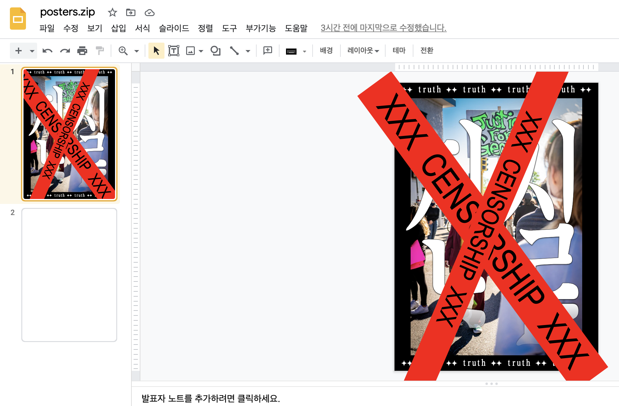 사실 카고(Cargo.site)에서 다른 사람들 포폴 찾아보다가, 어떤 디자이너가 EXPERIMENTS (="기타 등등... 실험") 코너에 자신이 구글슬라이드로 디자인한 포스터를 잔뜩 실어놓은 것을 엊그제 보았습니다. 같은 맥락으로 윈도우 (MS Windows) 그림판(Paint) 툴로 작업한 것도 있더군요. (근데 그림판은 진짜 결과물이 좀... 많이 별로였어요. 정말 순수한 실험이라고밖엔...)