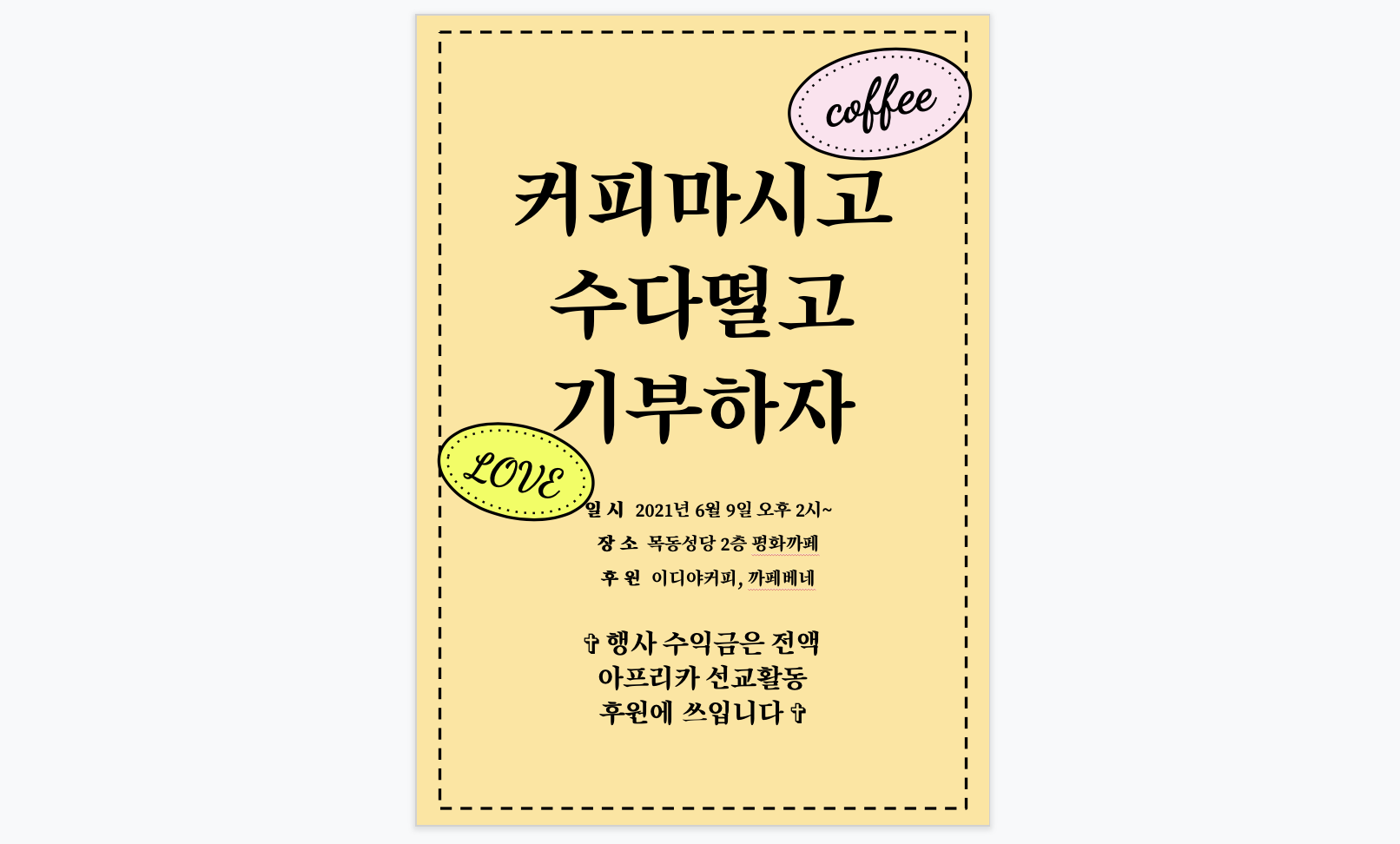 커피마시고 수다떨고 기부하자 일 시 2021년 6월 9일 오후 2시~ 장 소 목동성당 2층 평화까페 후 원 이디야커피, 까페베네 ✞ 행사 수익금은 전액 아프리카 선교활동 후원에 쓰입니다 ✞ coffee LOVE