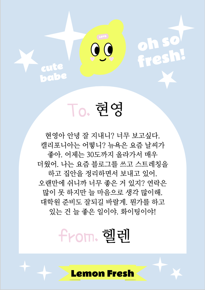이번 편지지 양식 정말 귀엽게 잘 나오지 않았나요? 상큼한 레몬이가 정말 귀여워서 웃음이 납니다. 나이 지긋하신 분들께 편지 써 드려도 아주 좋아하실 디자인이에요!!! 집에서 편하게 프린터로 편지지 뽑아서 사용하실 수 있었으면 좋겠습니다.