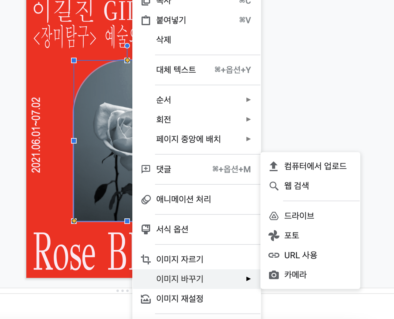 사진을 바꾸려면 기존 사진 오른쪽 마우스 클릭 > "이미지 바꾸기"