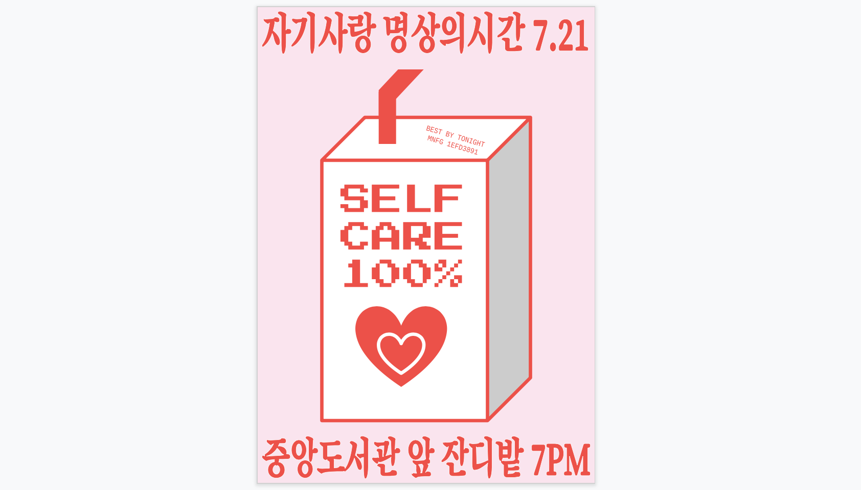 오늘은 오랜만에 구글슬라이드에서 제공하는 기본도형과 폰트만으로 귀여운 느낌의 포스터디자인을 만들어 보았어요. 피크닉 주스팩같은 모양으로 행사를 홍보할 수 있는 포스터입니다. 이번 포스터양식은 귀여운 느낌과 디지털적인 느낌, 복고풍 느낌이 동시에 있어서 조금 감성적인 형태의 행사나 파티 등에 사용해주시면 좋을 것 같습니다. SELF CARE 100%를 센스 있게 다른 문구로 바꾸어 주실 수도 있어요. 참고로, 텍스트박스는 워드아트 형태로 삽입되어 있으므로, 더블클릭해서 수정해주시면 됩니다.