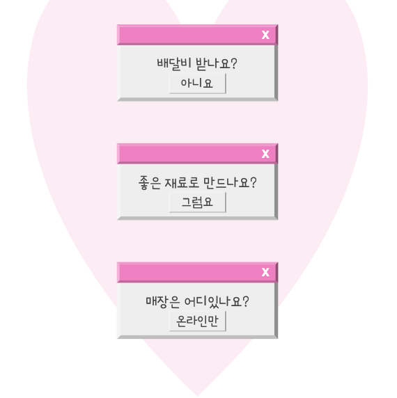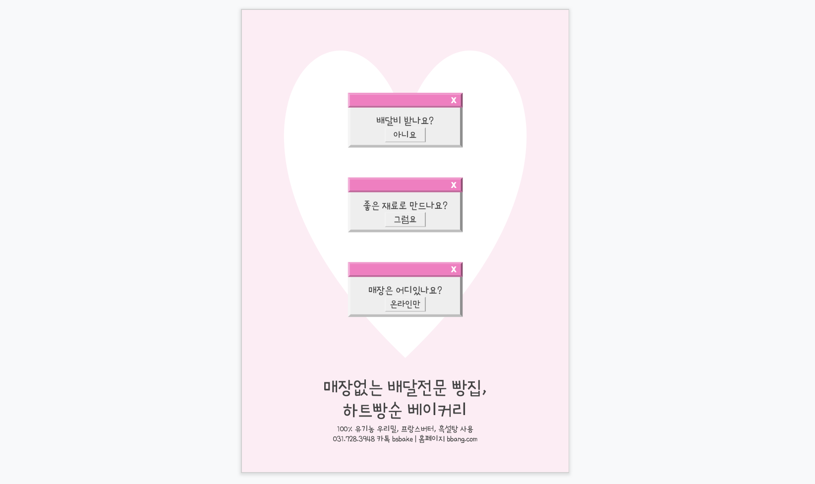 좋은 재료로 만드나요? 그럼요 X 매장은 어디있나요? 온라인만 X 배달비 받나요? 아니요 X 매장없는 배달전문 빵집, 하트빵순 베이커리 100% 유기농 우리밀, 프랑스버터, 흑설탕 사용 031.728.3948 카