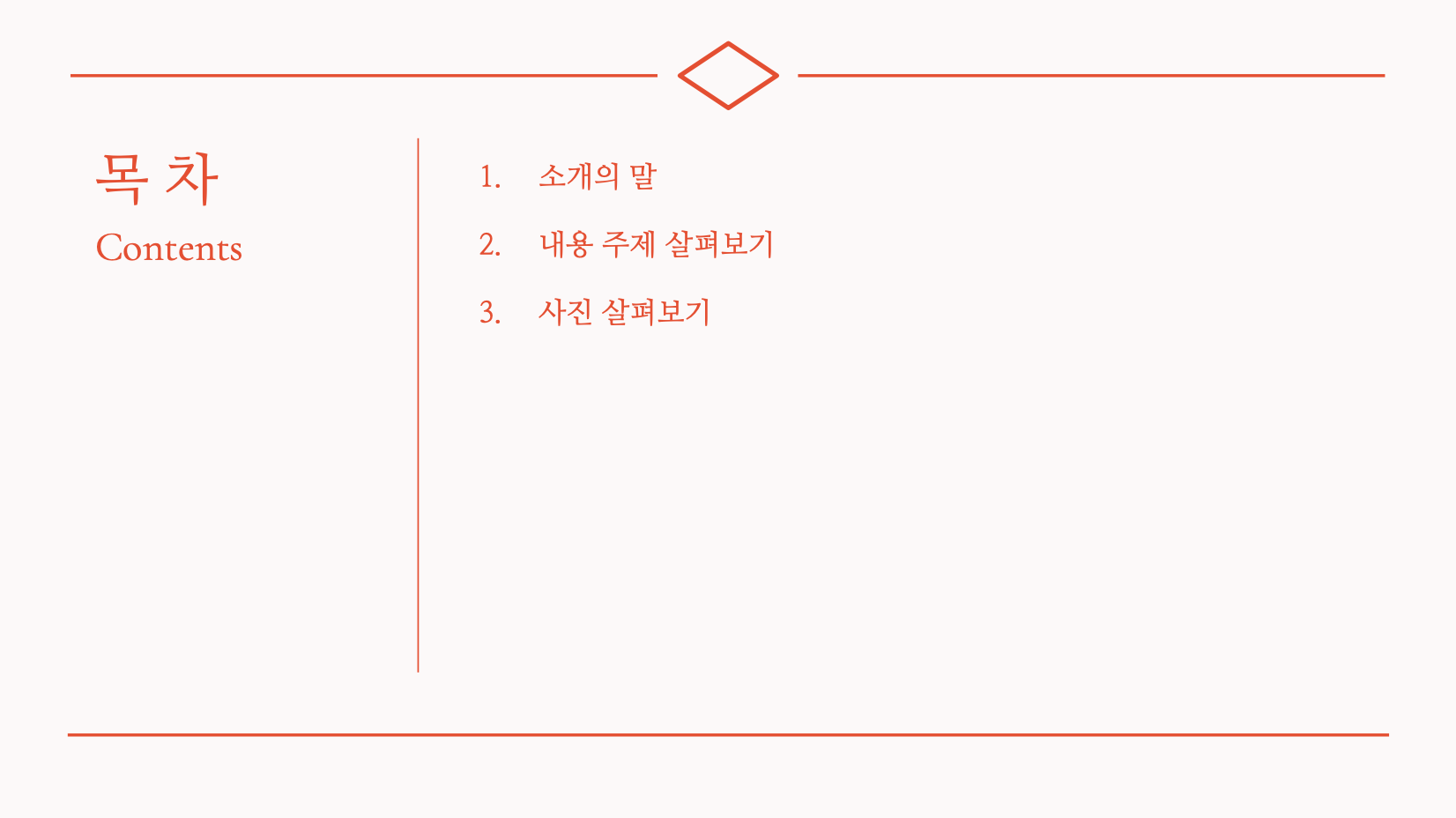 제목이나 목차는 알기 쉽게 왼편에 배치했습니다. 그리고 혹시 몰라서 중간제목 슬라이드도 하나 넣어 두었으니 필요하시면 같이 사용해주시면 될 것 같습니다.
