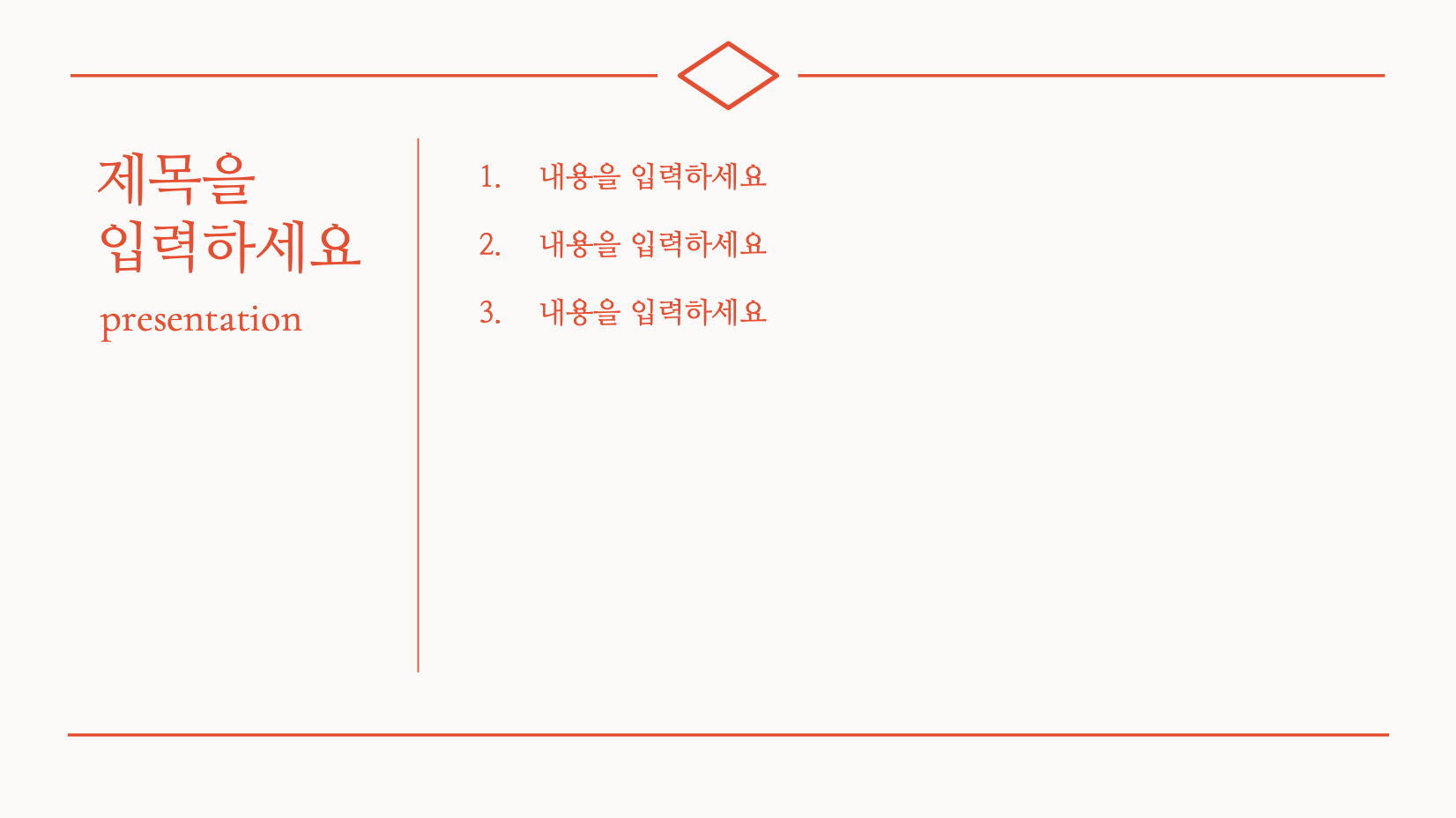오늘은 아주 오랜만에 구글슬라이드로 깔끔한 파워포인트 템플릿을 제작했습니다. 이번 템플릿 디자인의 특징은, 레드 라인을 이용해서 보는 사람들로 하여금 어디를 먼저 보아야 할 지, 어떤 내용이 어느 정도의 레벨인지를 쉽게 알 수 있도록 해 준다는 것입니다. 그리고 군더더기가 없고 심플하고 진지한 느낌이라, 아주 형식적인 자리에서도 사용 가능한 디자인입니다.