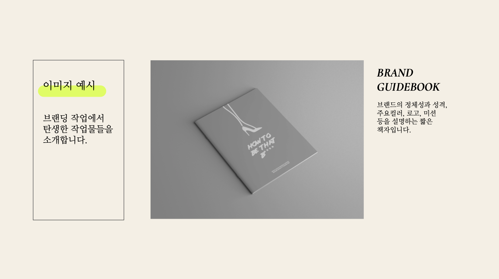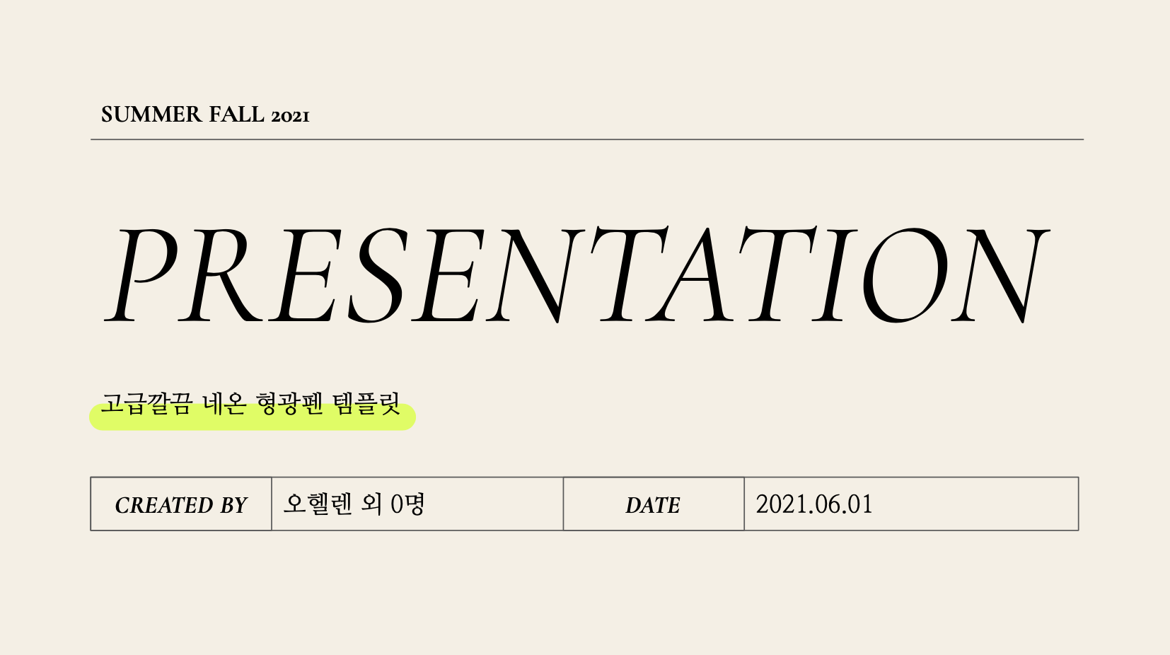베이지색 배경에 네온 옐로그린색의 형광펜으로 줄을 쫙~그어서 어디를 먼저 보아야 할 지를 알려주는 게 이번 디자인의 key 컨셉입니다. 베이지색에 고급스럽게만 배치해 두면 예쁘긴 하지만 자칫 지루하거나 너무 진지함으로 치우친 느낌을 줄 수 있는데요, 네온 형광펜 디테일이 포인트가 되어서 그런 답답함을 해소해 주고, 강조점에 시선이 집중되게 하는 효과를 가져옵니다.