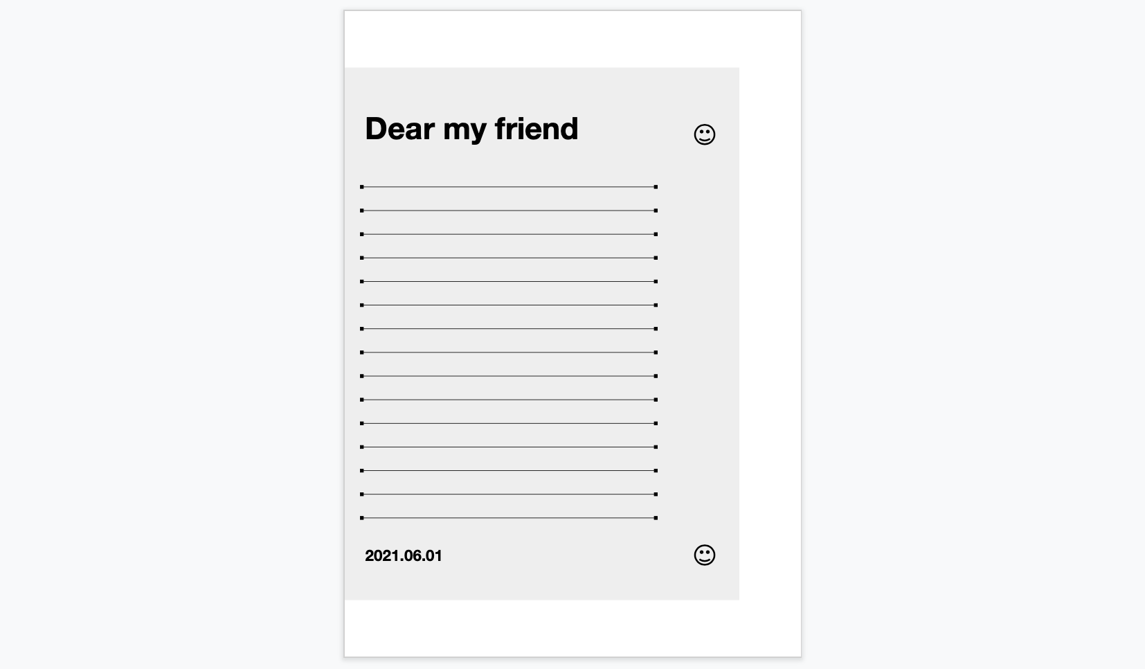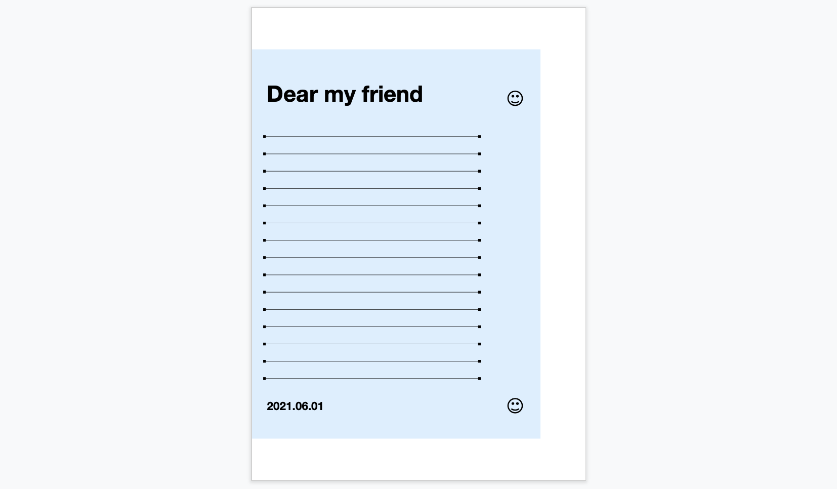 오늘은 구글슬라이드로 아주 귀엽고, 간결한 편지지양식을 디자인해 보았습니다. 귀여운 스마일로 도장을 2번 찍었고, 글씨체는 깔끔한 영문 글자체로 유명한 헬베티카를 사용하였기에 매우 친숙한 느낌이 드실 겁니다. 파스텔톤으로 색상은 총 5가지이며, 매우 기본적인 디자인이라서 부모님이든, 친구든, 이성친구든 누구에게나 무난하게 편지를 쓰실 수 있습니다. 위에 "Dear my friend" 문구와 맨 아래 날짜를 바꾸어서 인쇄하거나 편지지 작성하시는 것, 꼭 잊지 마세요! 템플릿 사용하는 방법은, 템플릿에 접속하여 파일 > 사본만들기를 이용하시면 본인 소유의 파일이 하나 생성되오니, 저에게 권한 신청하지 마시고 해당 링크에서 바로 복사해서 사용해주세요. 별다른 수정권한 신청이 필요하지 않습니다.