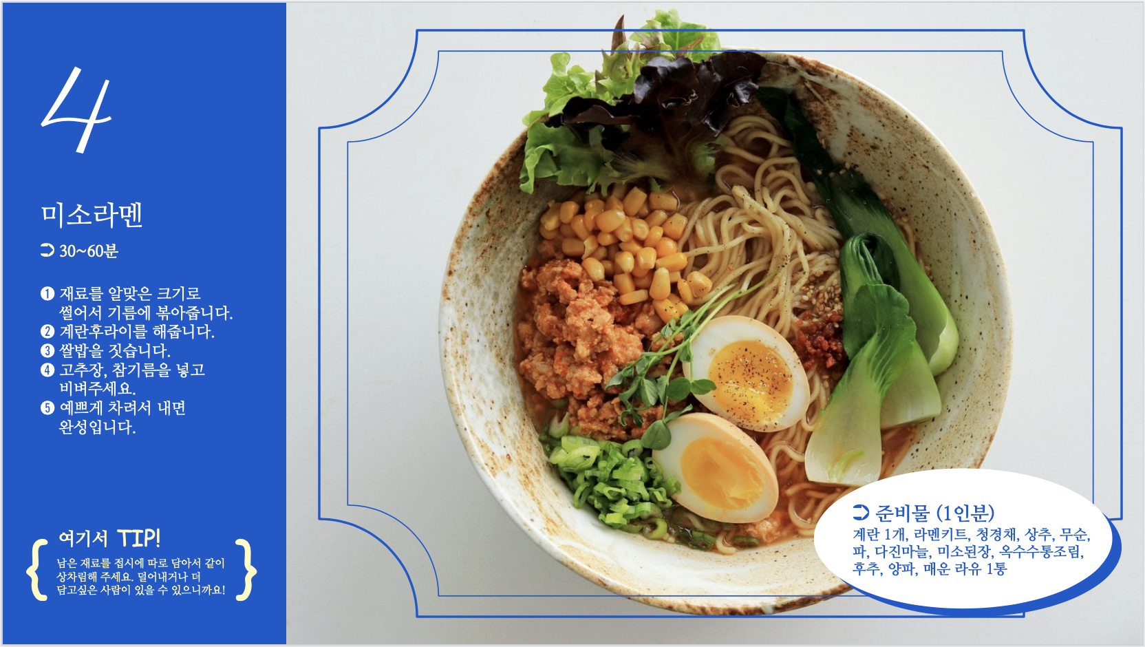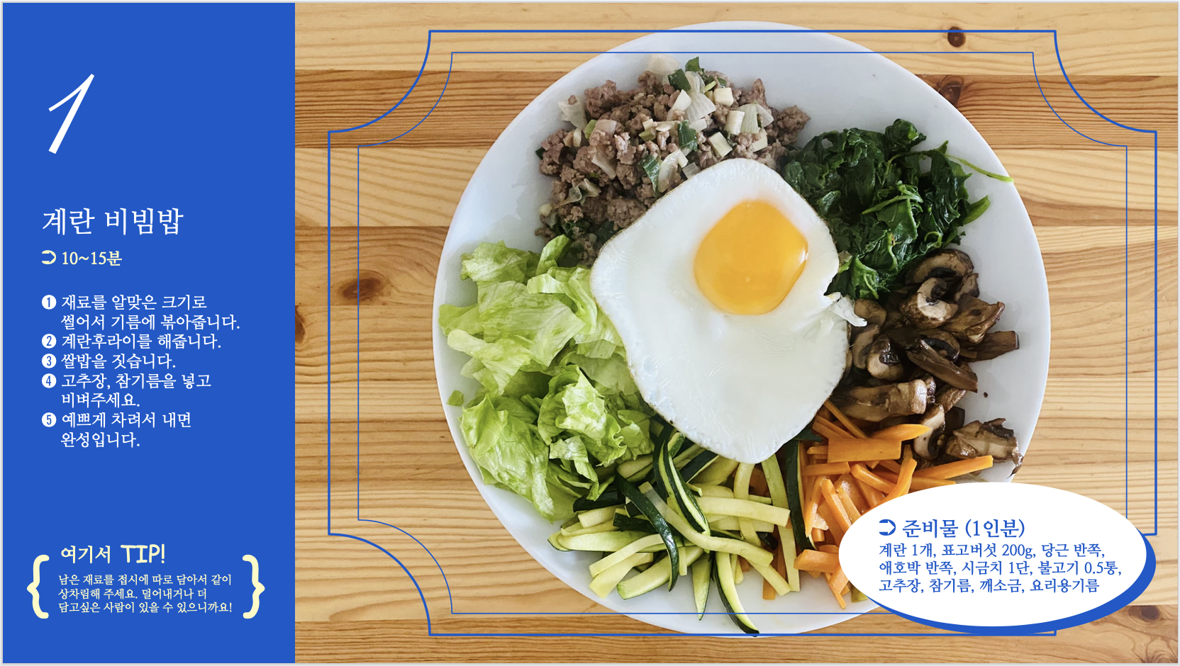 오늘은 구글슬라이드로 나만의 요리책을 만드실 수 있는, 화이트와 블루컬러를 활용한 아주 깔끔한 레시피북 템플릿을 만들어 보았습니다. 아주 깔끔하고 감성적이면서 전문적인 느낌을 주는 템플릿입니다. 인쇄해서 다른 사람들에게 나눠줄 수도 있고, 1장씩 인쇄해서 회사 게시판에 붙여 놓아도 되는, 아주 다방면으로 활용 가능한 쓸모있는 템플릿이에요. 까페를 운영하는 분이시라면, 1장씩 작게 인쇄해서 쿠폰과 함께 나눠주는 이벤트를 할 수도 있겠네요. 요리 말고도 DIY를 하는 방법을 설명하는 책자로도 안성맞춤입니다.