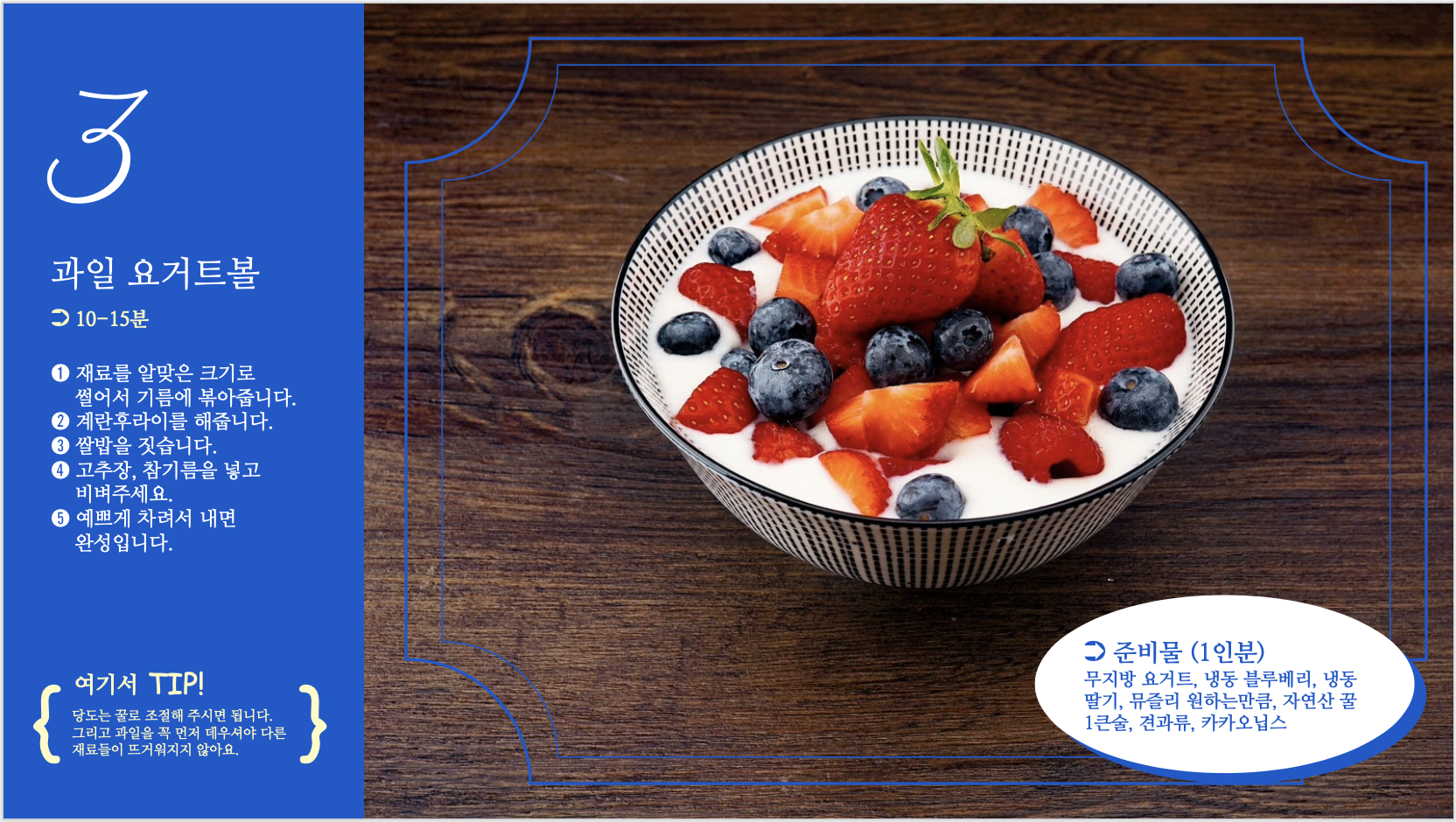 흰색 배경에 블루와 옐로로 포인트를 주었고, 전체적으로 나눔명조와 Comic Sans를 사용했습니다. 넘버링으로는 스크립트 폰트를 사용해서 분위기를 더욱 감성적이고 고급스럽게 만들어 주었습니다. 제가 좋아하는 요리들을 예시로 넣어두었습니다. 들어가 있는 레시피를 자세히 읽어 보시면 dummy로 넣어 둔 내용이며, 각 사진과 매치하지는 않습니다. 체계가 잘 잡혀 있고, 비교적 쓰기 쉬운 레이아웃이라서 원하는 문구와 사진으로 변경만 해 주시면 됩니다. 이번 템플릿은 많은 텍스트를 넣을 수 없으므로, 아주 짧은 레시피들로 구성된 책자 만들기에 추천합니다.