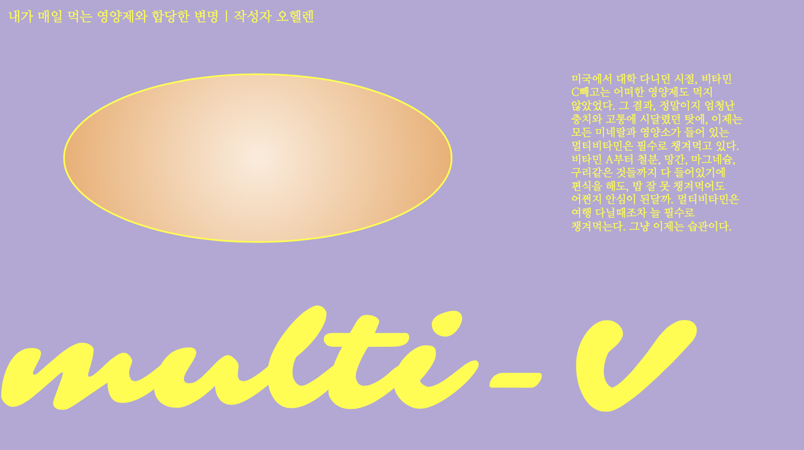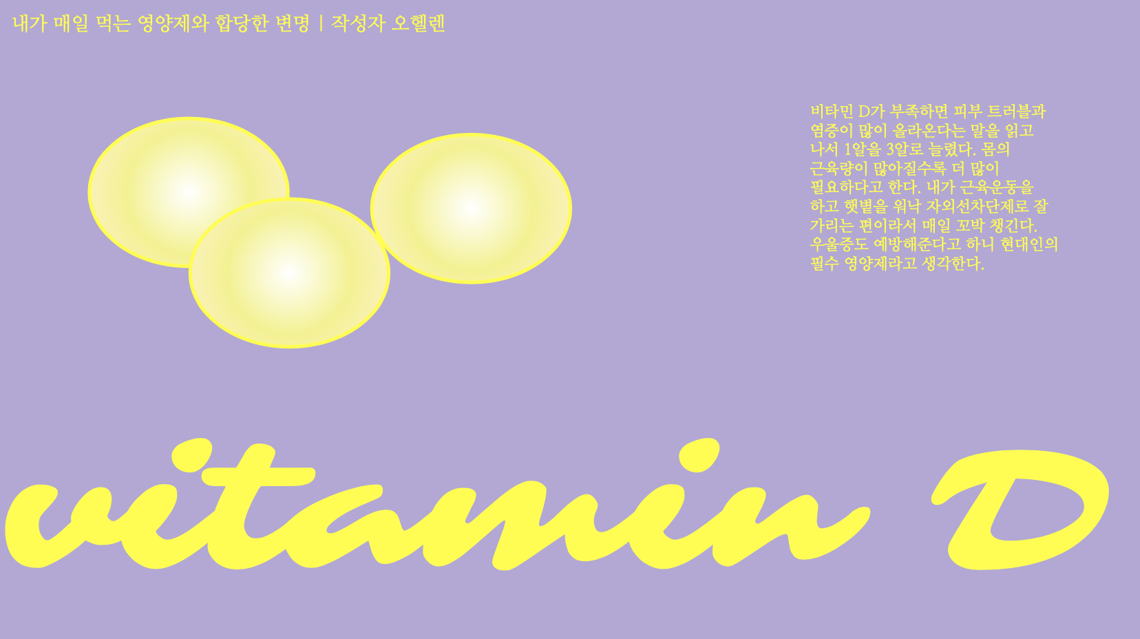 노란색 하면 먹는 것이 생각나는 만큼, 이번에는 제가 매일 챙겨먹는 영양제라는 소재로 예시 내용을 넣어두었습니다. 차분한 연보라 배경에 샛노란 강조색 딱 2가지 색만을 이용해서 내용에 바로 시선이 가고, 집중이 잘 되는 레이아웃입니다. 영문 제목을 크게 배치해서 주목성이 좋고, 시선을 어디에 두어야 할 지가 명확합니다. 글씨체는 귀여운 필기체형 글자체를 사용해서, 가벼운 느낌과 감성적인 느낌, 레트로 느낌을 내시기에 좋습니다.