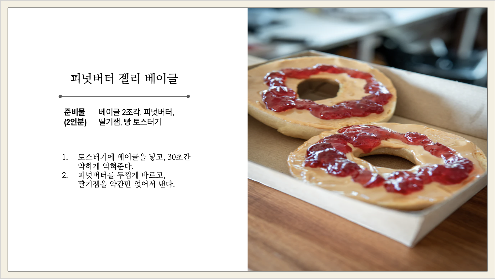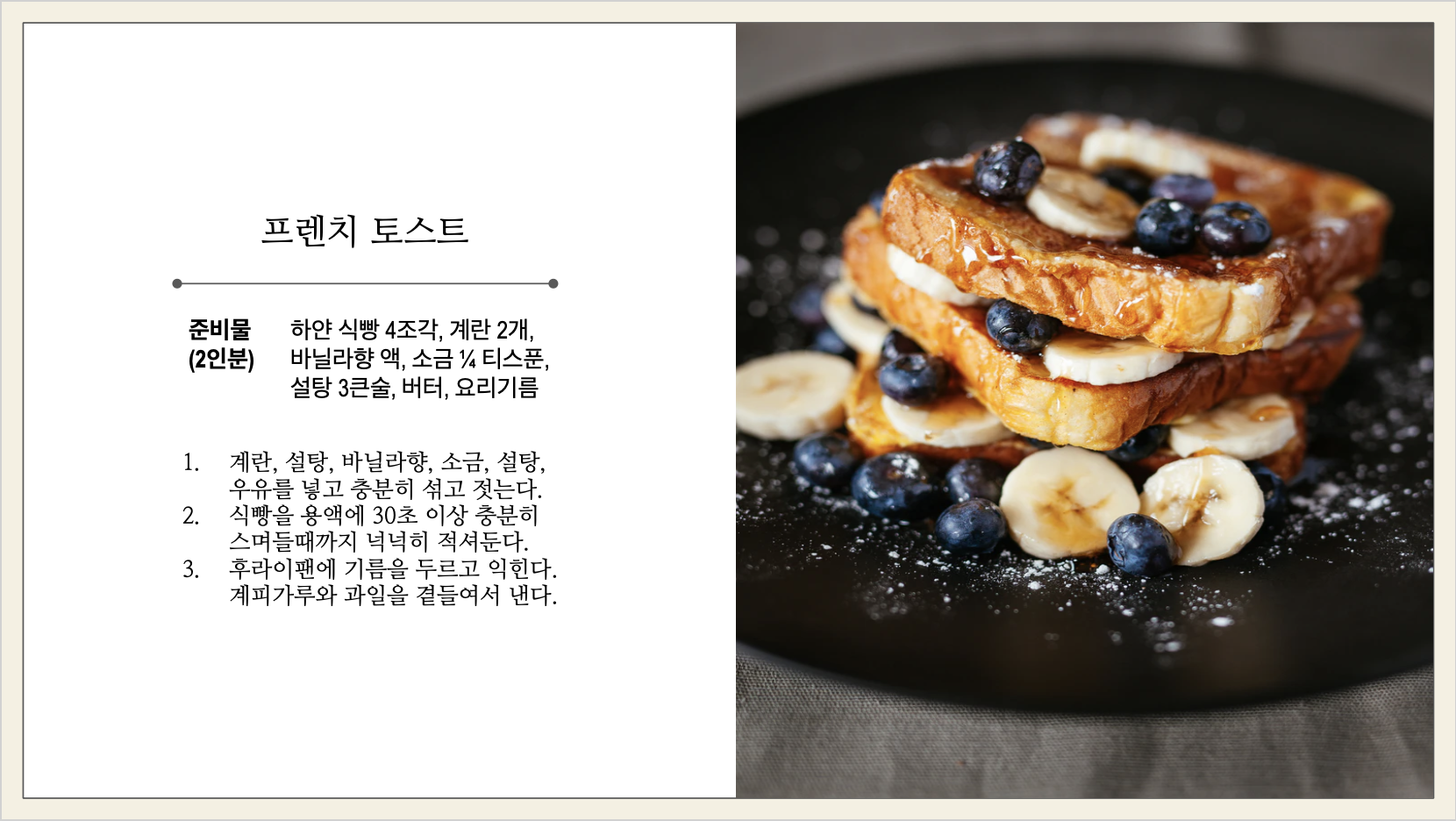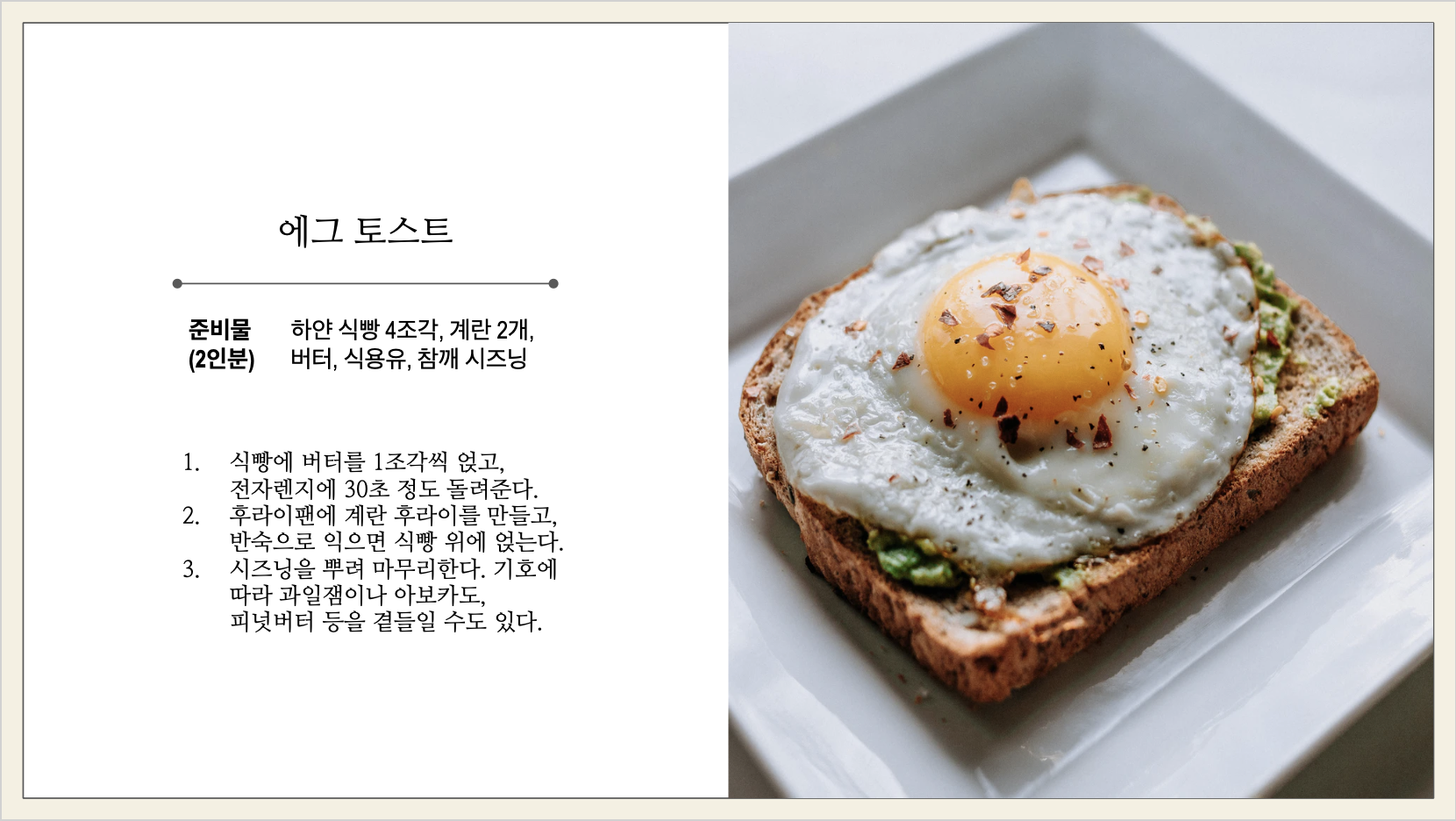배이지색과 회색, 검정색, 흰색을 이용해서 여유롭고 차분한 느낌을 줍니다. 나눔명조가 사용되어서 고급스러워보이고, 읽기 좋습니다. (참고로, 제목 중간에 사용된 빵 모양은 이모지입니다. 제목같은 곳에 이모지를 하나씩 사용해 주시면 귀엽게 포인트를 주실 수 있어요.) 요리 이름이 크게 들어가고, 그 아래 준비물과 준비단계가 상세 설명되어 있습니다. 준비물의 경우, 다른 글자체를 활용해서 조금 더 눈에 띄게 해 주었고 다른 텍스트와 차별을 두었습니다. 저는 예시로 아주 간단하게 빵과 재료만 있으면 되는 초간단 레시피들만을 넣어 두었는데요, 이처럼 이번 초간단 레시피북 양식은 아주 짧은 레시피들로 구성된 책자 만들기에 추천합니다. 텍스트를 많이 넣으면 어지러워 보일 수 있기 때문이에요!