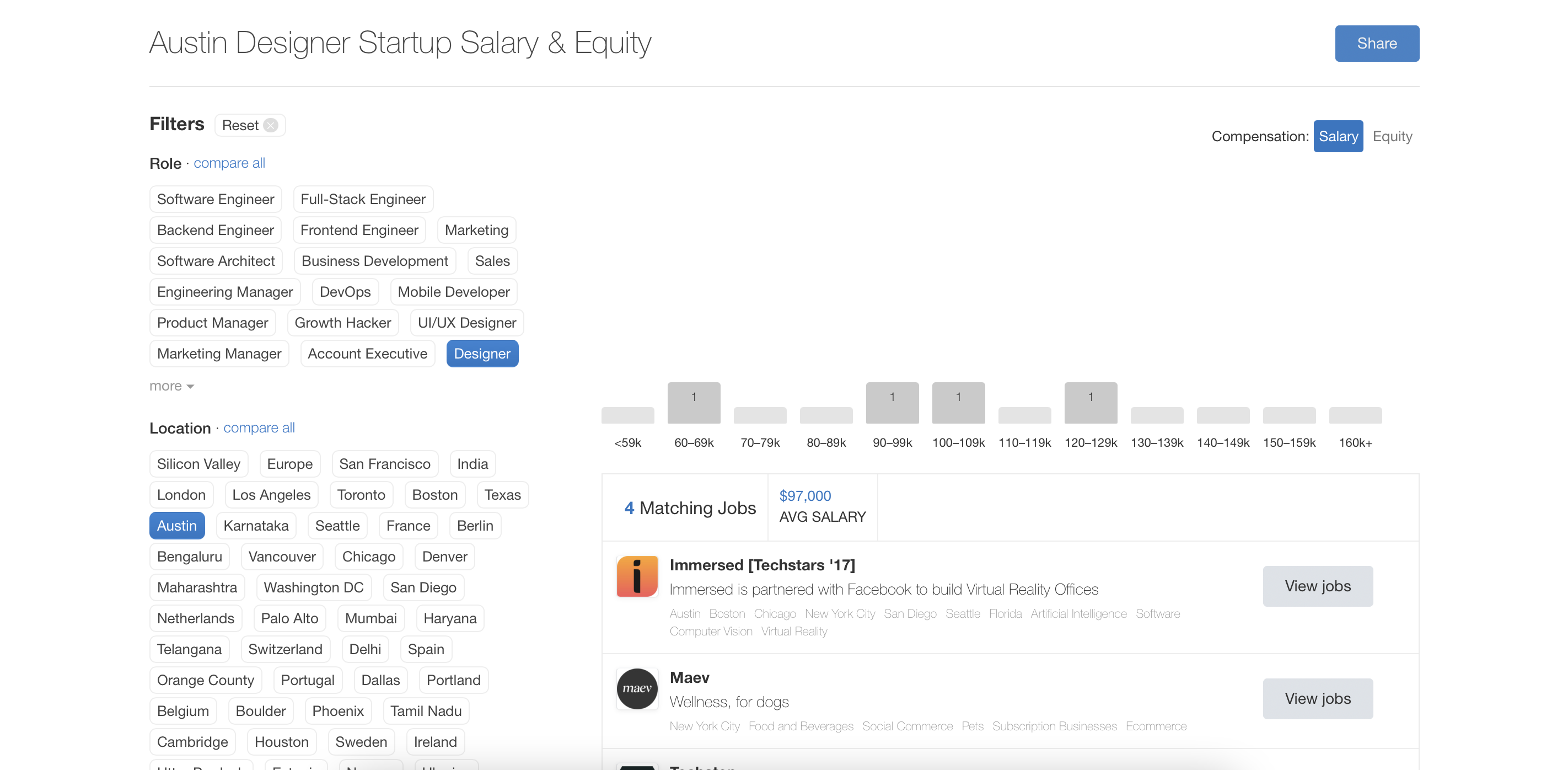 깔끔하고 보기 좋은 인터페이스에 연봉수준까지 아주 상세하게 나와있습니다. 스타트업이 이렇게 많은 줄 몰랐고, 또 스타트업이 포진해 있는 지역 중에 실리콘밸리와 오스틴(텍사스)뿐 아니라 런던, 시에틀, 베를린, 뱅갈루, 밴쿠버, 네덜란드, 스페인, 아일랜드, 스위스, 뉴델리(인도) 지역의 연봉과 오픈 잡 포지션까지 보여주고 있었습니다. 엄청난 정보력!