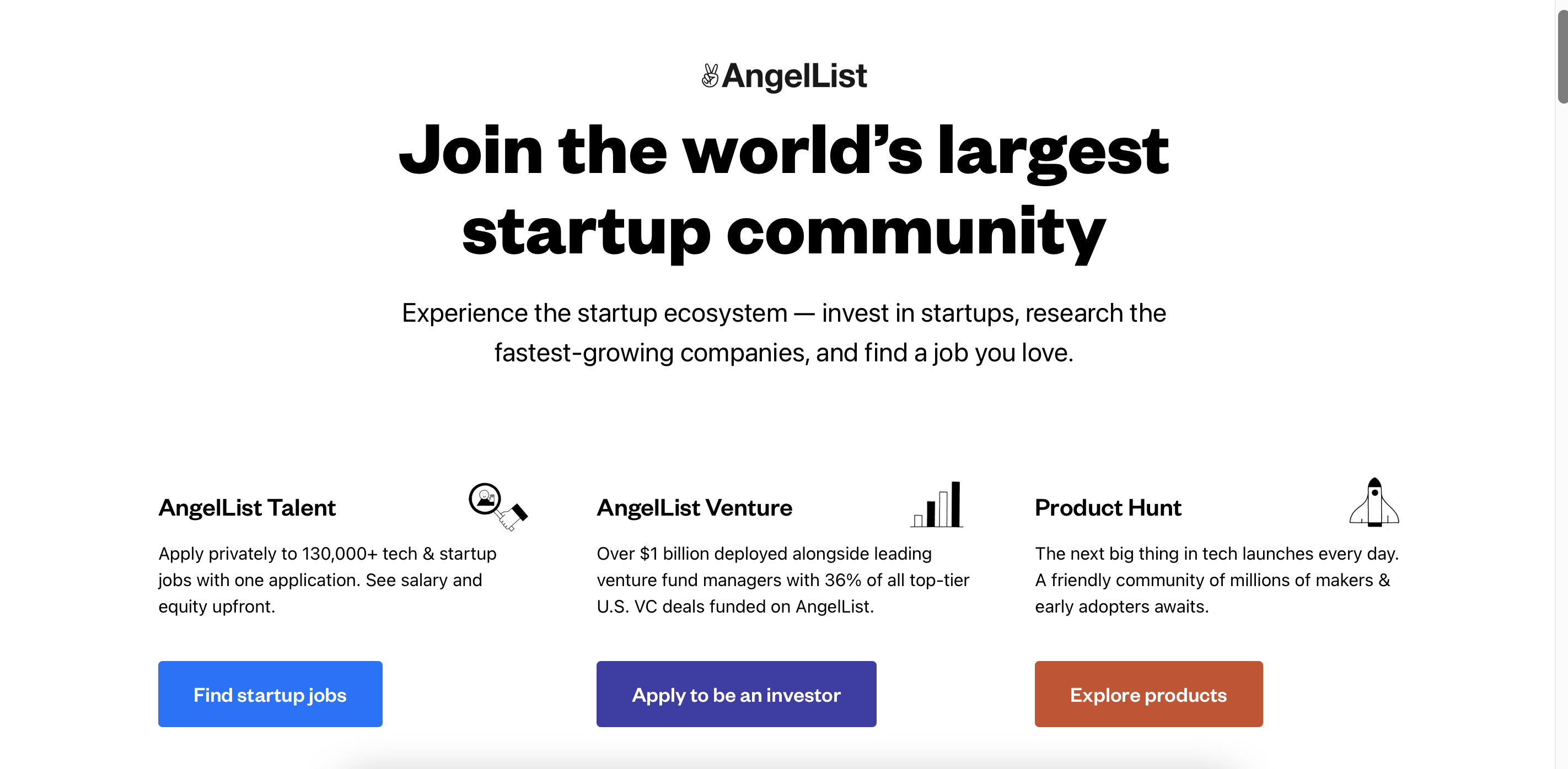 일단 사이트에 들어가보면 자기네들이 어떤 사이트인지를 소개하고 있습니다. 스타트업 전용 커뮤니티이자 "링크드인"이라고 보시면 됩니다. 구인구직뿐 아니라 투자, 그리고 내가 같이 하고싶은 프로젝트 찾기까지 지원하는 올인원 스타트업 커뮤니티입니다. 각종 인턴십, 풀타임 포지션 지원은 물론 재미있는 프로젝트 찾아보기와 지역별 연봉 수준 열람, $1000부터 투자까지 가능합니다.