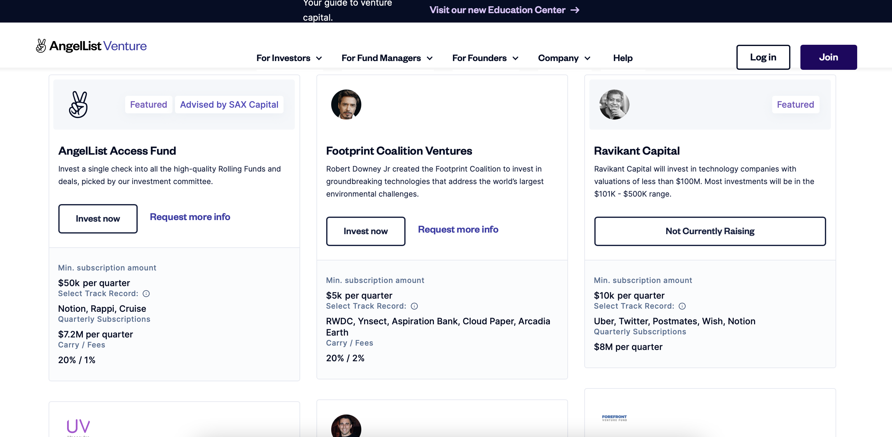 벤처캐피탈에 분기별로 돈을 납입하는 법도 있는데, 투자를 받고 있는 VC의 수가 정말 어마어마합니다. 가장 첫 번째 페이지에는 로버트 다우니 주니어(아이언맨 배우)가 직접 운영하는 "Footprint Coalition Ventures"라는 펀드가 가장 위에 노출되어 있네요. ㅎㅎ 신기합니다.