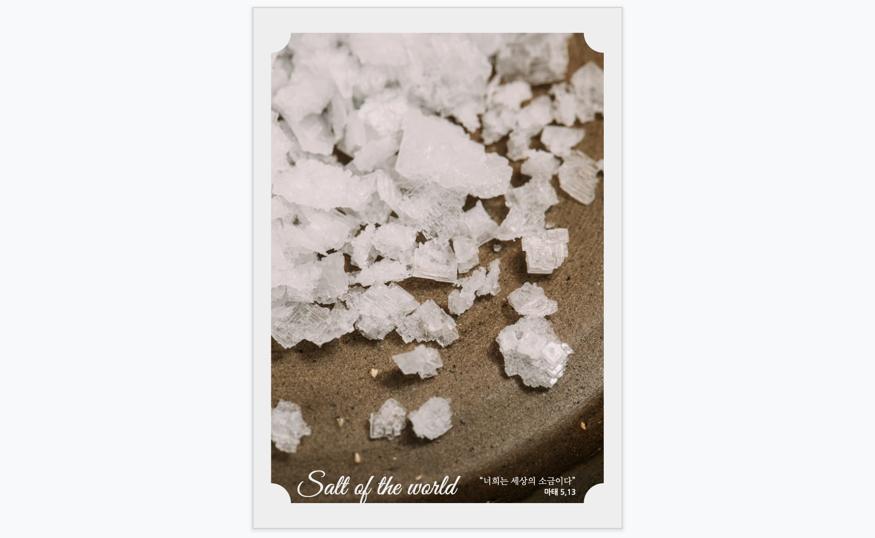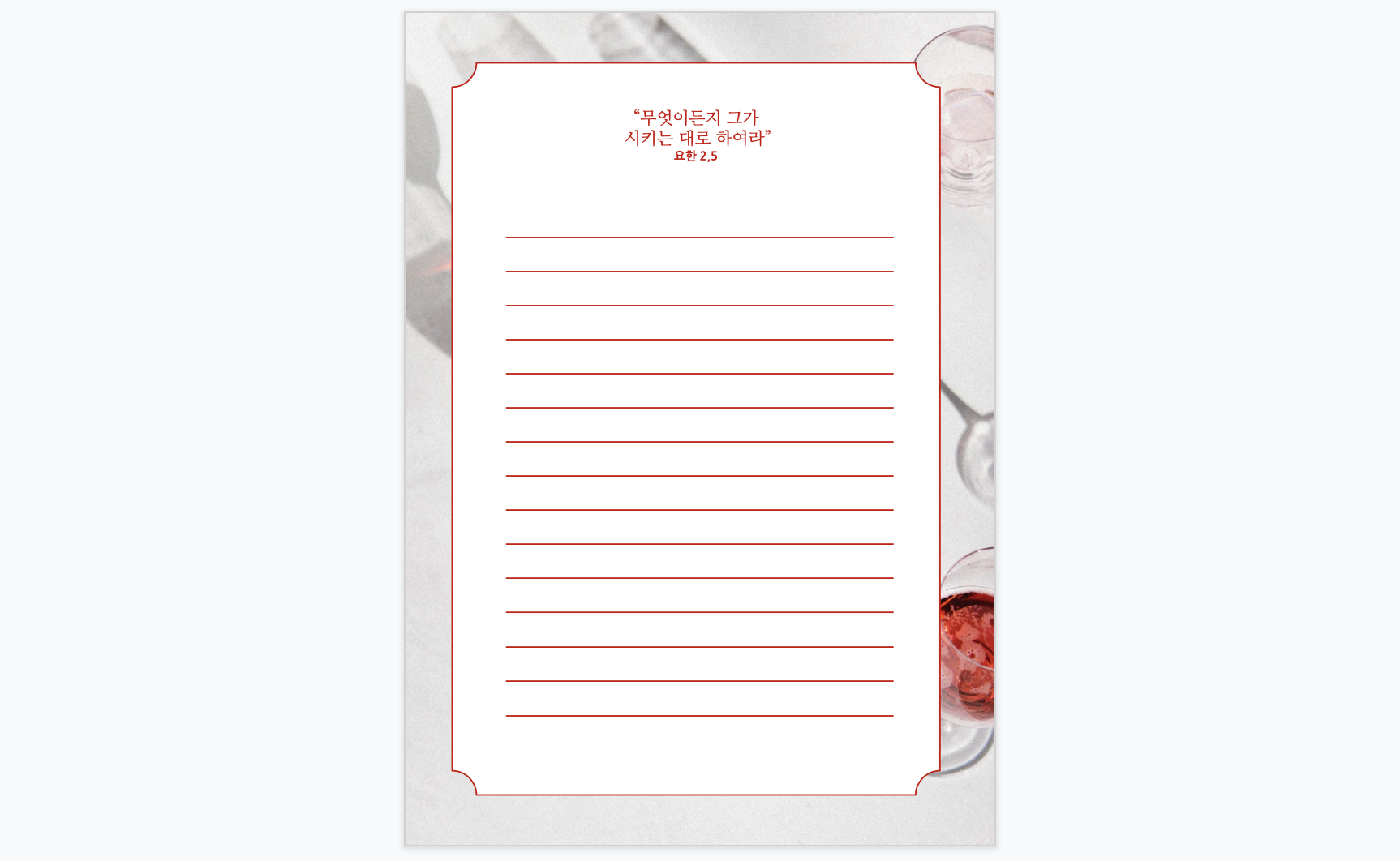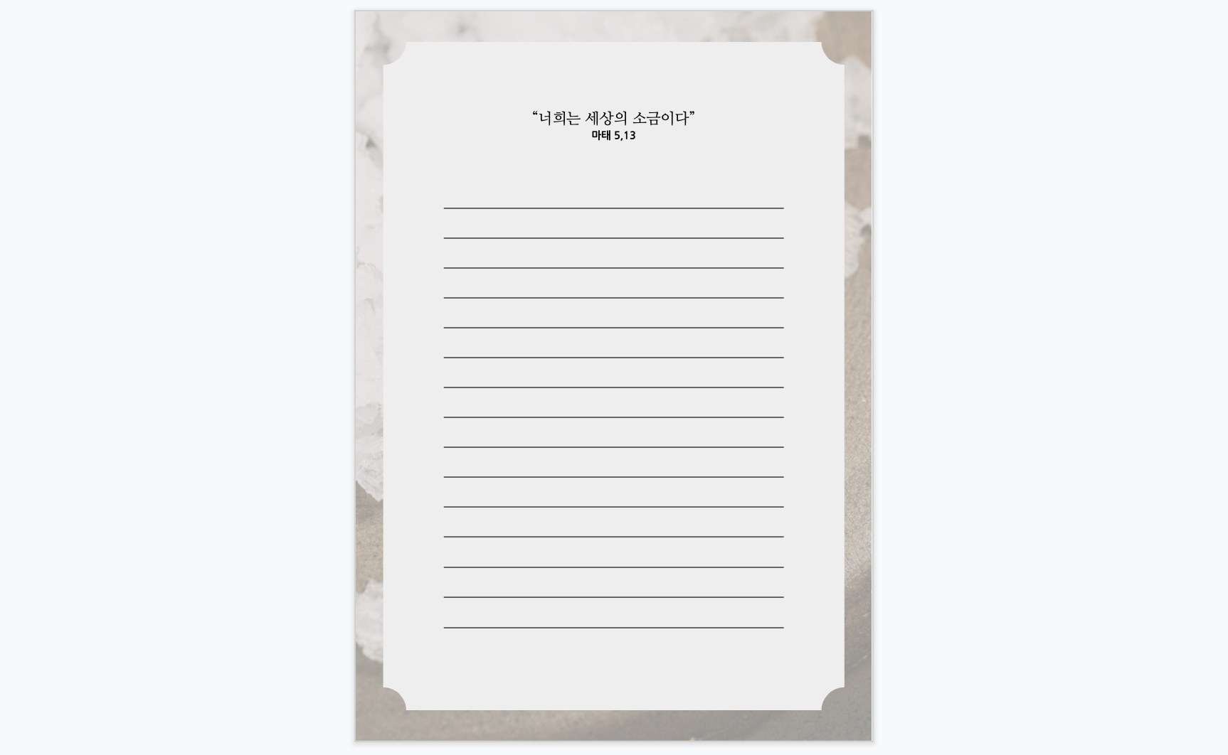 그런 의미에서, 오늘은 복음말씀 구절을 담은 2가지 성당 편지지 & 봉투세트를 디자인했습니다. 너희는 세상의 빛과 소금이라고 말씀하신 마태오 복음 구절과 요한복음에서 전하는 카나의 혼인 잔치 기적에서 성모님의 말씀을 고화질의 사진과 함께 담아낸 감성적인 느낌의 편지지입니다. 청년회 엠티(MT)나 레지오, 기도모임, 마니또 등 성당 내 친목 및 종교 활동에 활용하시기에 좋을 것 같습니다. 솜씨가 좋으신 분들은, 이번 템플릿을 적절히 수정하여 포스터로도 활용하실 수 있으니 한 번 도전해보세요!!