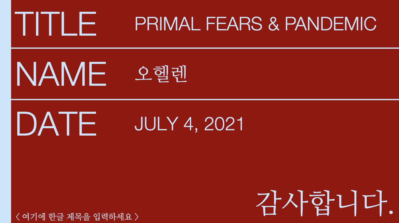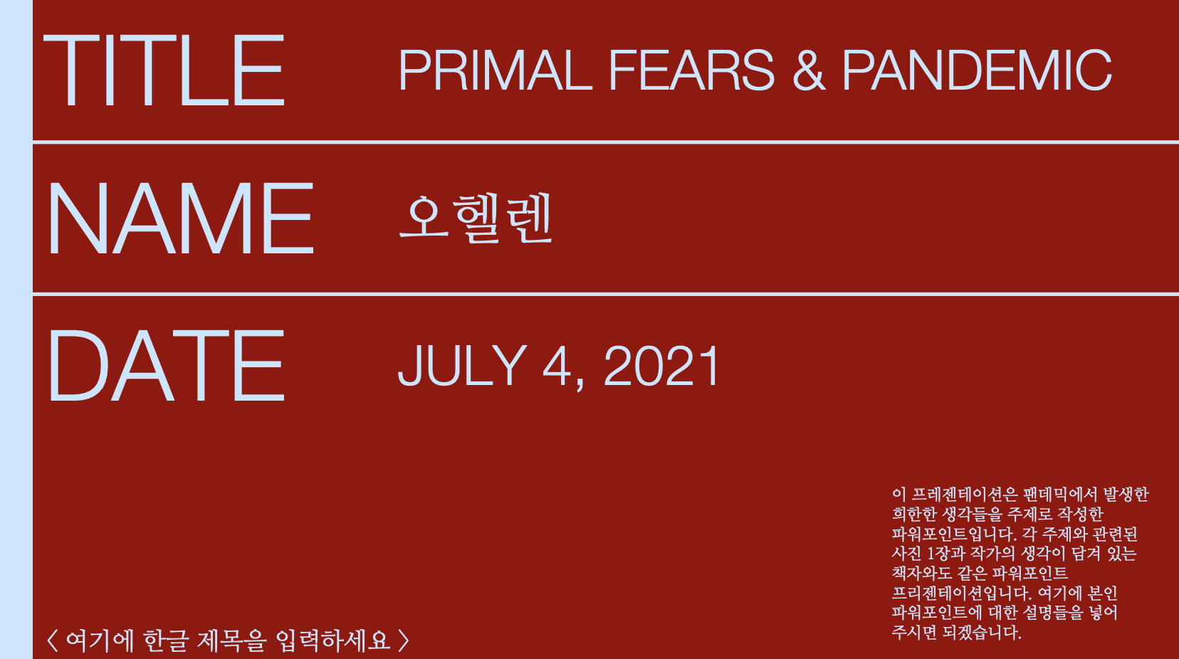 TITLE NAME DATE PRIMAL FEARS & PANDEMIC 오헬렌 JULY 4, 2021 이 프레젠테이션은 팬데믹에서 발생한 희한한 생각들을 주제로 작성한 파워포인트입니다. 각 주제와 관련된 사진 1장과 작가의 생각이 담겨 있는