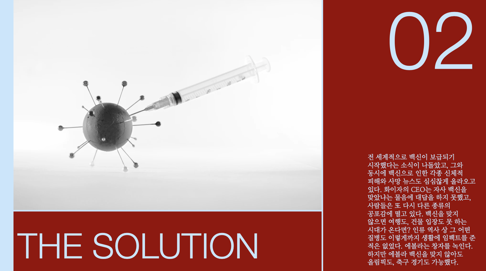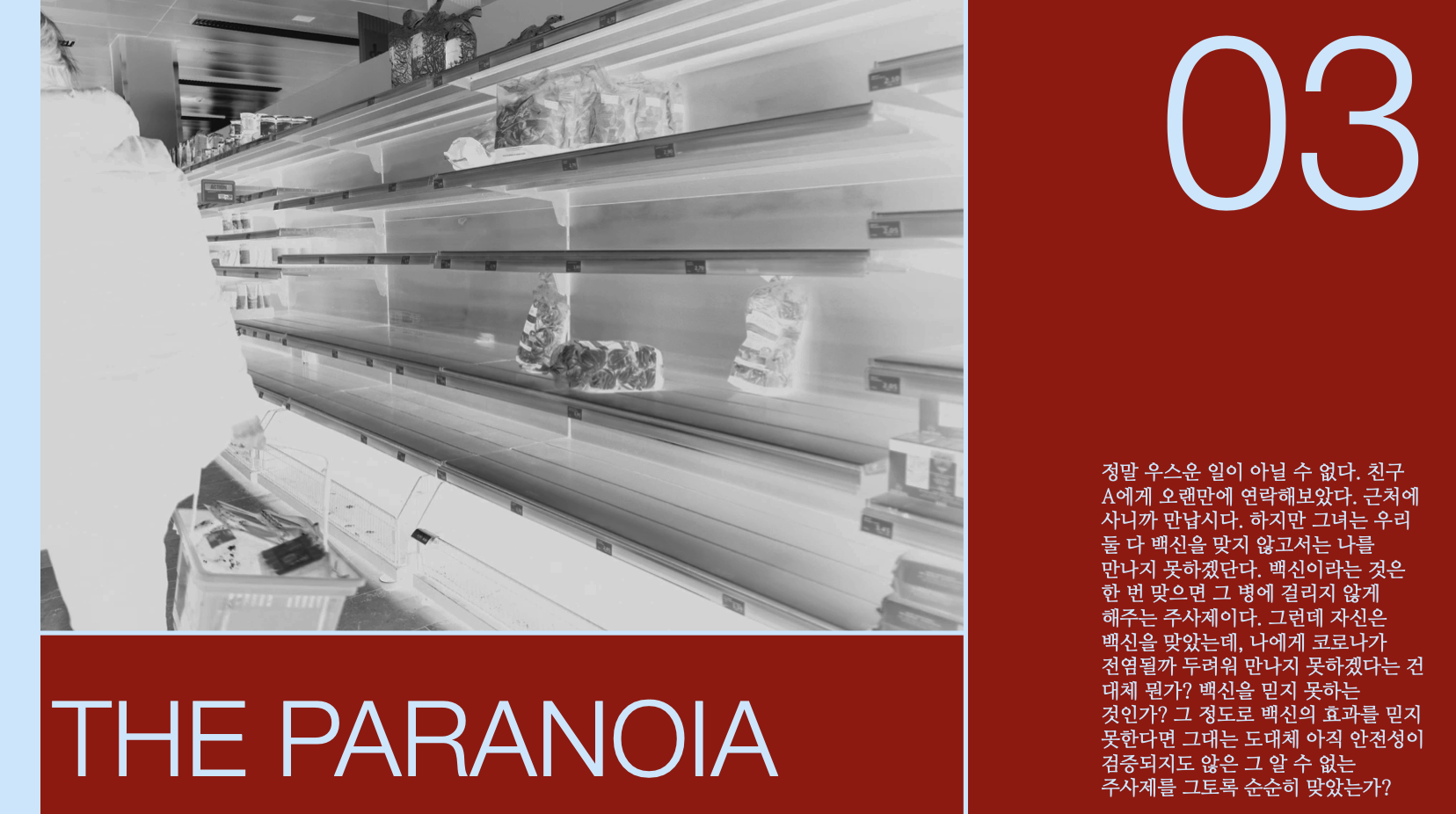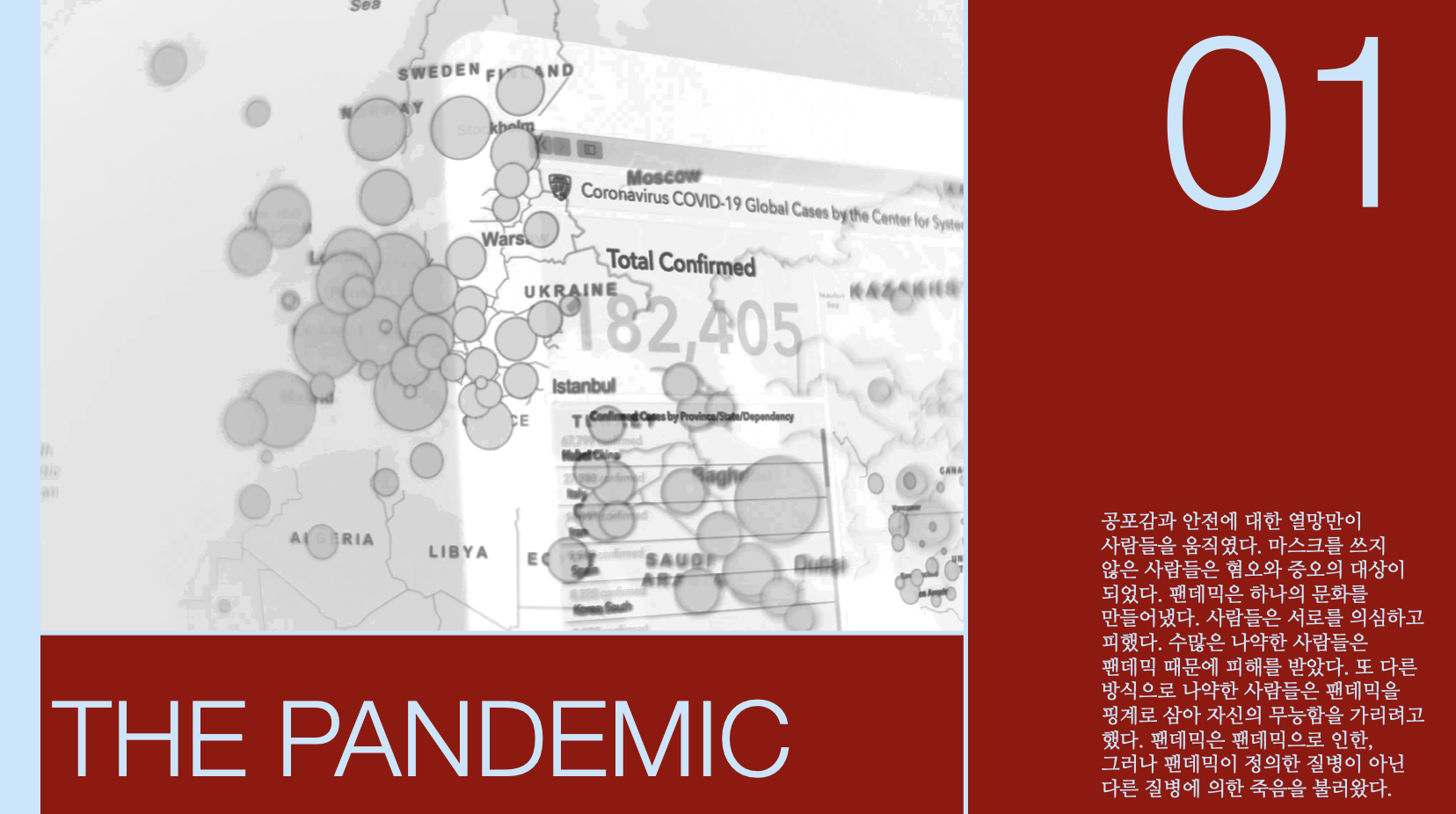 사진을 넣으실 경우, 배경이나 본문 텍스트가 이미 시끄러운 느낌을 주고 존재감이 강한 색깔이므로, 컬러 사진을 그대로 이용하시기보다는 흑백이나 다른 필터를 씌워서 사용하시는 게 좋을 것 같아요. 내용은 지난번과 같은 코로나 팬데믹에 대한 지극히 주관적인 내용 샘플을 채워 두었으니, 얼마든지 수정해서 사용하시면 됩니다.