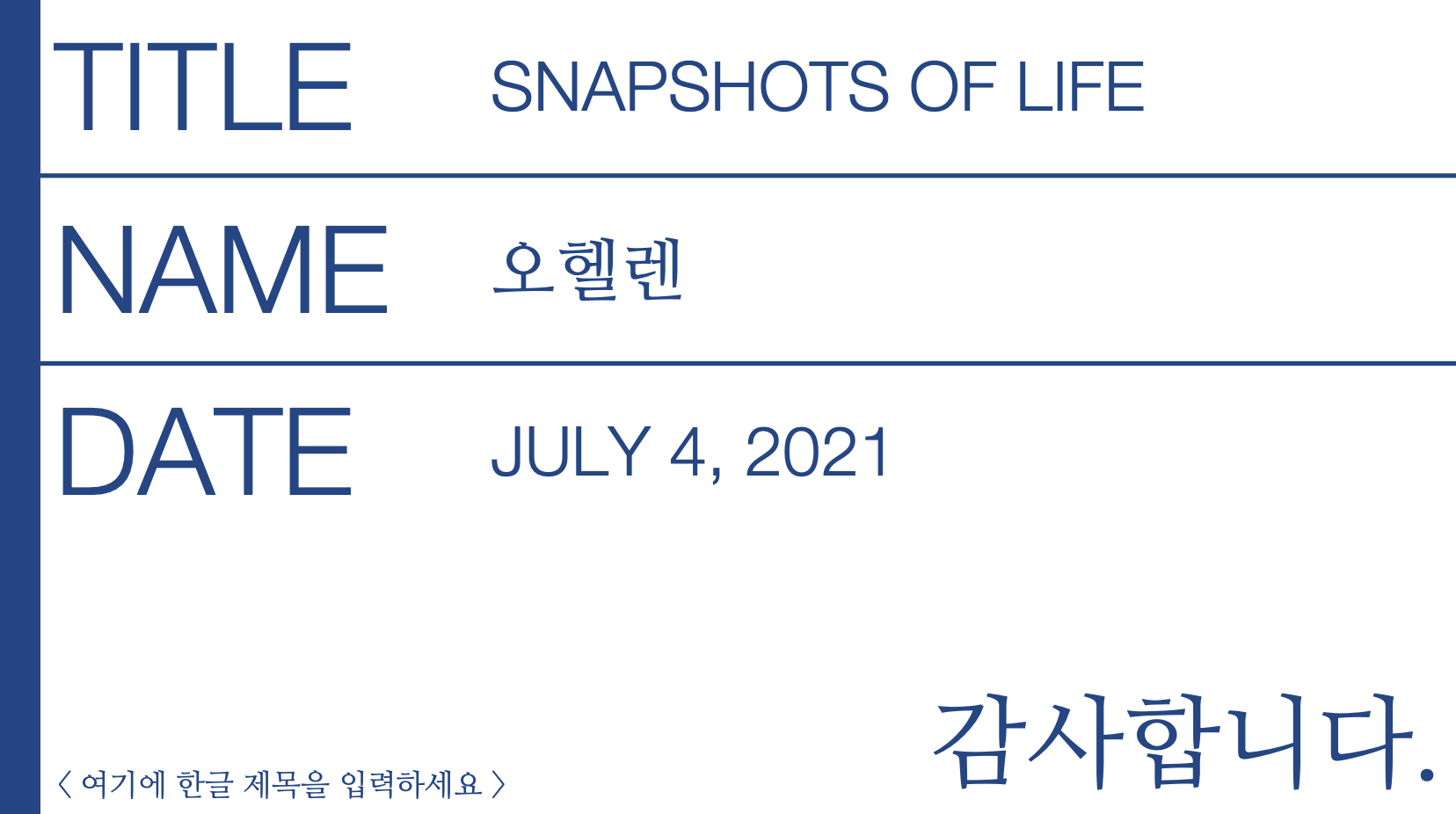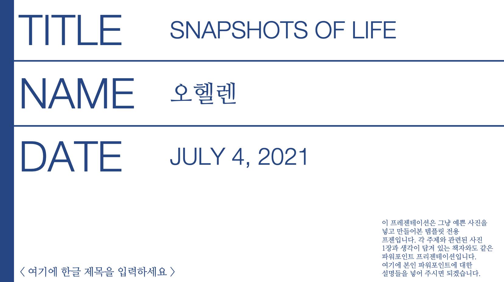 TITLE NAME DATE SNAPSHOTS OF LIFE 오헬렌 JULY 4, 2021 이 프레젠테이션은 그냥 예쁜 사진을 넣고 만들어본 템플릿 전용 프젠입니다. 각 주제와 관련된 사진 1장과 생각이 담겨 있는 책자와도 같은 파워포인