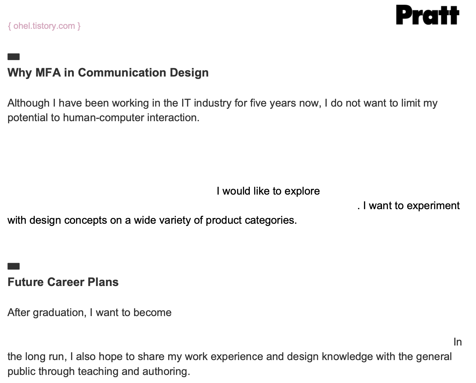 - 그 다음에는 석사 학위 취득 후 어떤 커리어패스를 만들어 나가고 싶은지, 어떤 인물로써 성장해 나가고 싶은지를 쓰시면 됩니다. 저같은 경우는 이 부분에서 비전공자로써의 이점을 강조했습니다. 마케팅부서에서, 개발 부서에서 있었던 저는 디자인뿐 아니라 그 디자인이 실제로 어떤 컨텍스트에서 쓰이는지, 클라이언트가 무엇을 원할지를 이해하는 사람으로써, 통합적 솔루션을 제공할 수 있는 디자이너로 활동하고 싶다고 썼습니다. 그 후 저의 경험을 사람들과 나누고 가르치는 사람으로 성장하고 싶다고 썼습니다. 그게 바로 이 블로그 활동
