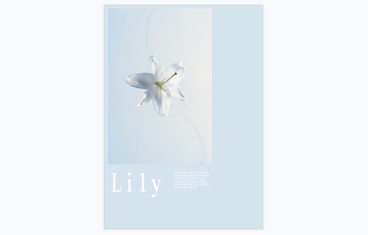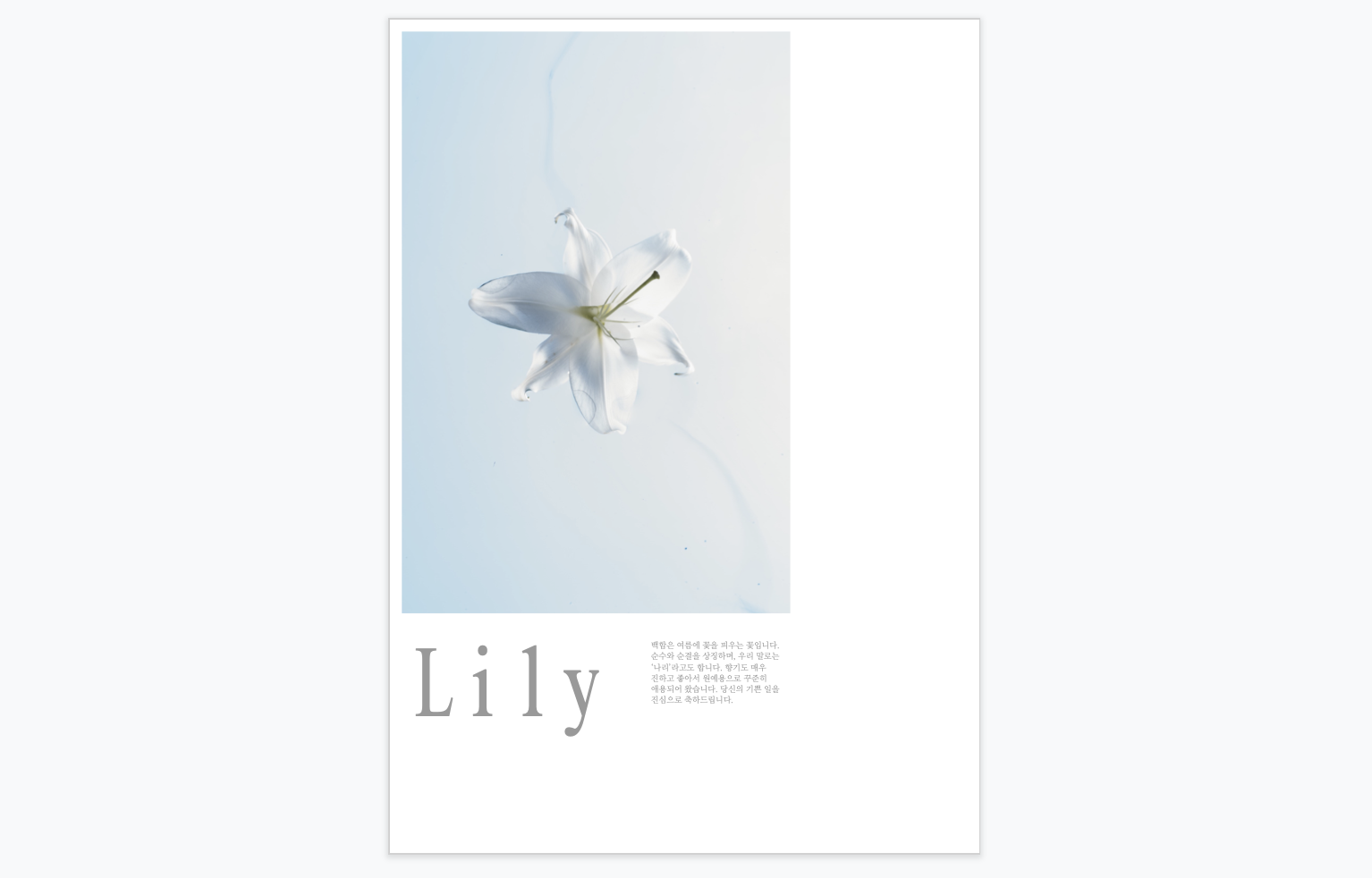 Lily 백합은 여름에 꽃을 피우는 꽃입니다. 순수와 순결을 상징하며, 우리 말로는 ‘나리’라고도 합니다. 향기도 매우 진하고 좋아서 원예용으로 꾸준히 애용되어 왔습니다. 당신의 기쁜 일을