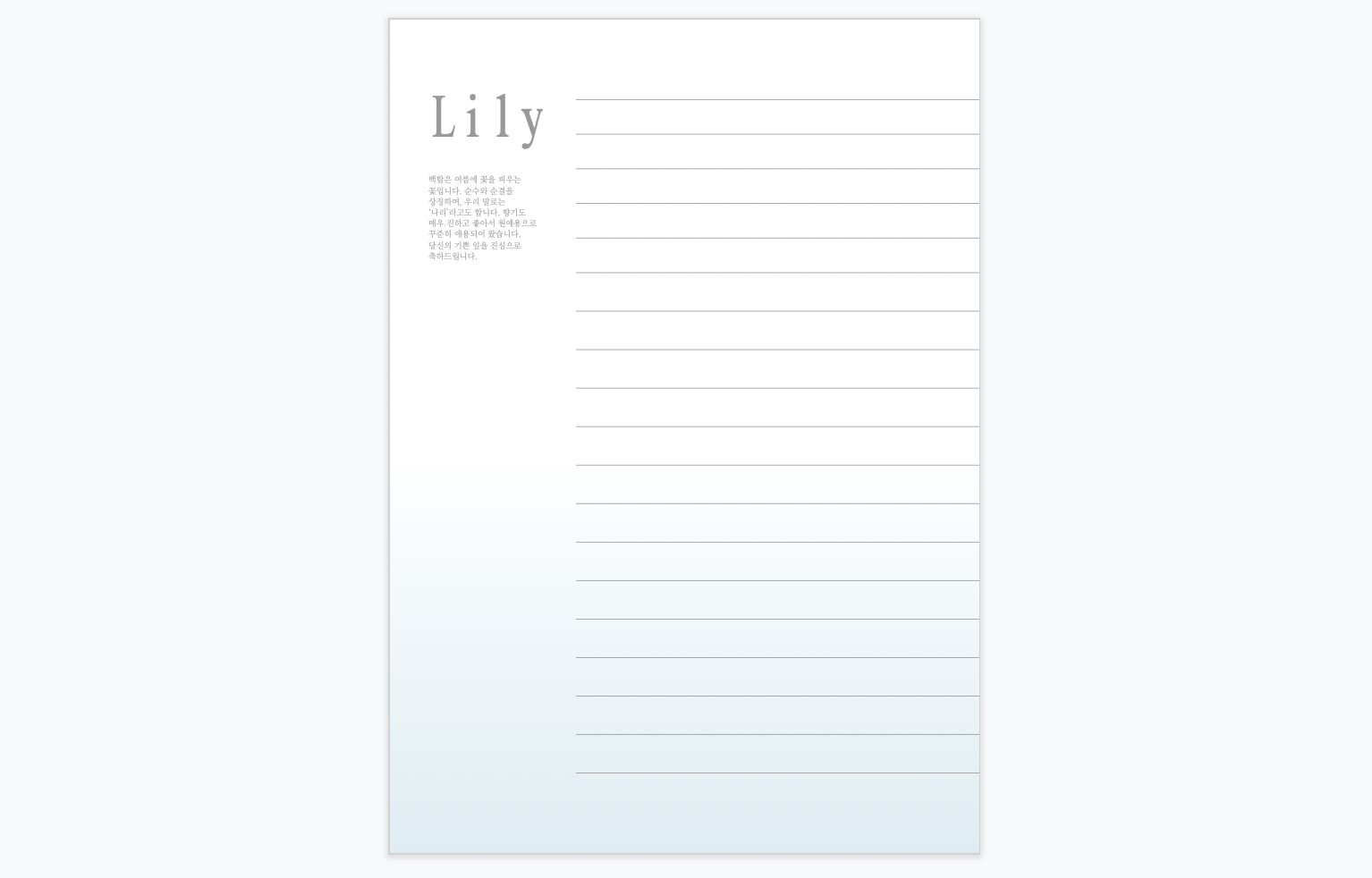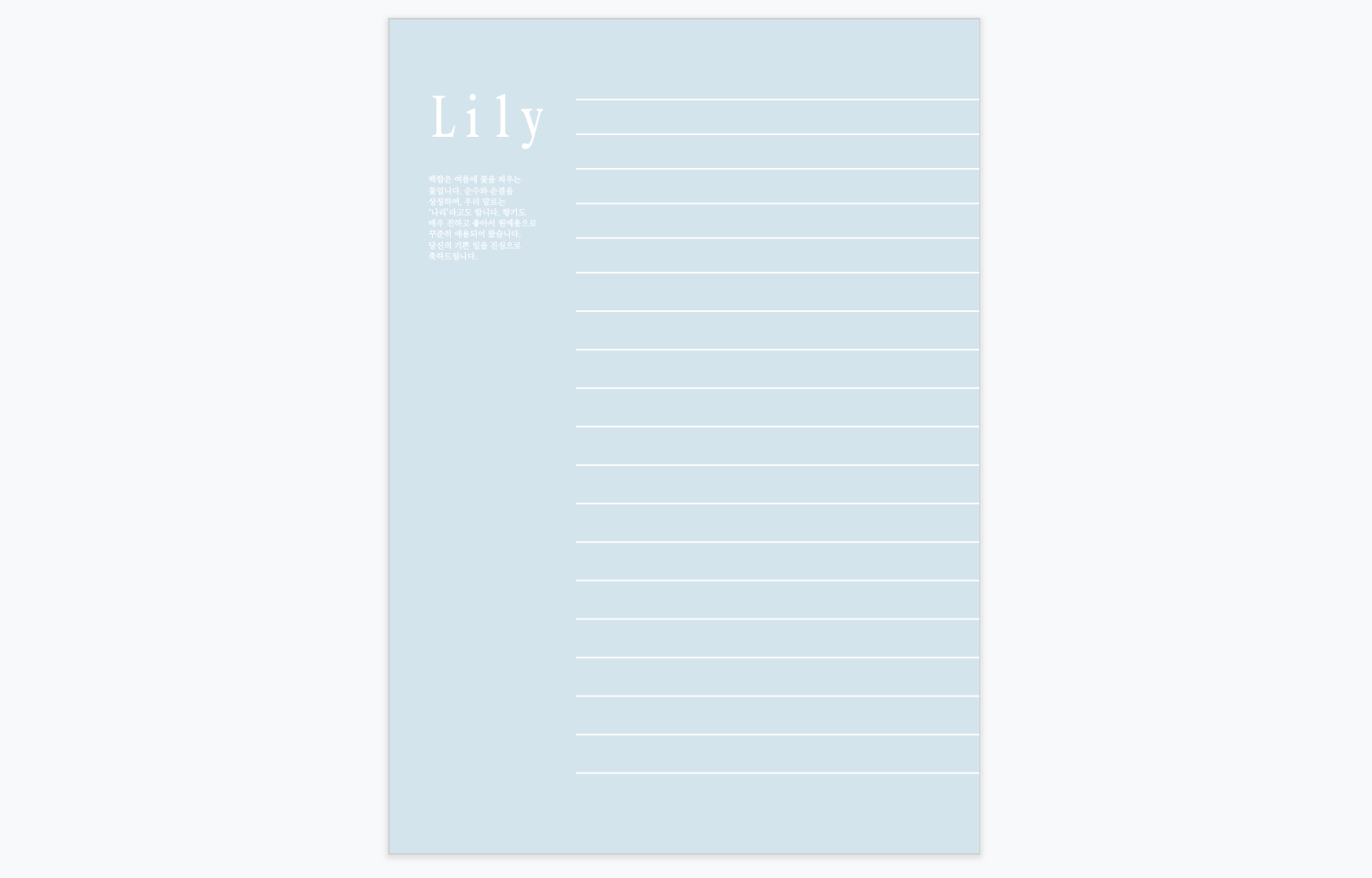 백합은 꽃 크기도 크고, 시원하게 쫙 뻗어서 피어나서 시원한 느낌과 고급스러운 느낌을 동시에 주는, 정말 예쁜 꽃인 것 같아요. 누군가에게 좋은 소식이나 축하의 말을 전하는 곳에 널리 쓰이면 정말 좋을 것 같습니다. 저는 요즘 여름 계절학기를 듣느라 굉장히 피곤한 시간을 보내는 중인데, 저도 잠시나마 숙제를 멈추고 편지지 디자인 작업을 하면서 조금 쉬는 느낌을 받을 수 있었어요. 다음 주면 학기가 끝나니, 더더욱 열심히 예쁜 PPT와 편지지, 이력서들을 올리도록 하겠습니다.