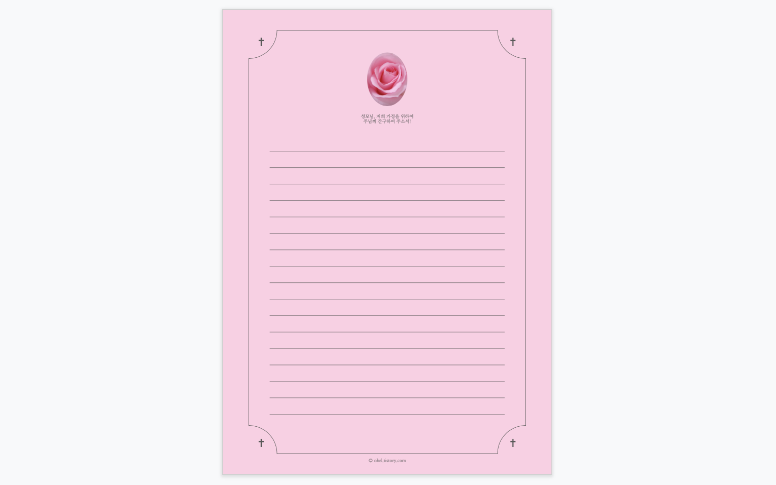 오늘은 어제 <성모님 편지지 봉투세트 1>에 이어서, 이번에는 성당에 다니는 가톨릭 신자 가정에서 가족끼리 서로 편지를 주고 받을 때 좋은 "가정의 기도" 전문이 들어간 편지지와 봉투 세트를 디자인해 보았어요. 분홍색 장미와 하얀 장미를 활용해서 깔끔하고 심플하면서도 고급스러운 느낌을 줍니다. 사용된 글씨체는 "나눔명조"입니다. 편지지가 필요할 때 고품질로 인쇄해서, 성모성월인 5월이자 가정의 달에 서로 편지를 주고 받을 때 활용해보세요. 성당에 다니는 부모님께 어버이날 선물로 손편지를 써 드리면 특히 좋아하실 거에요.