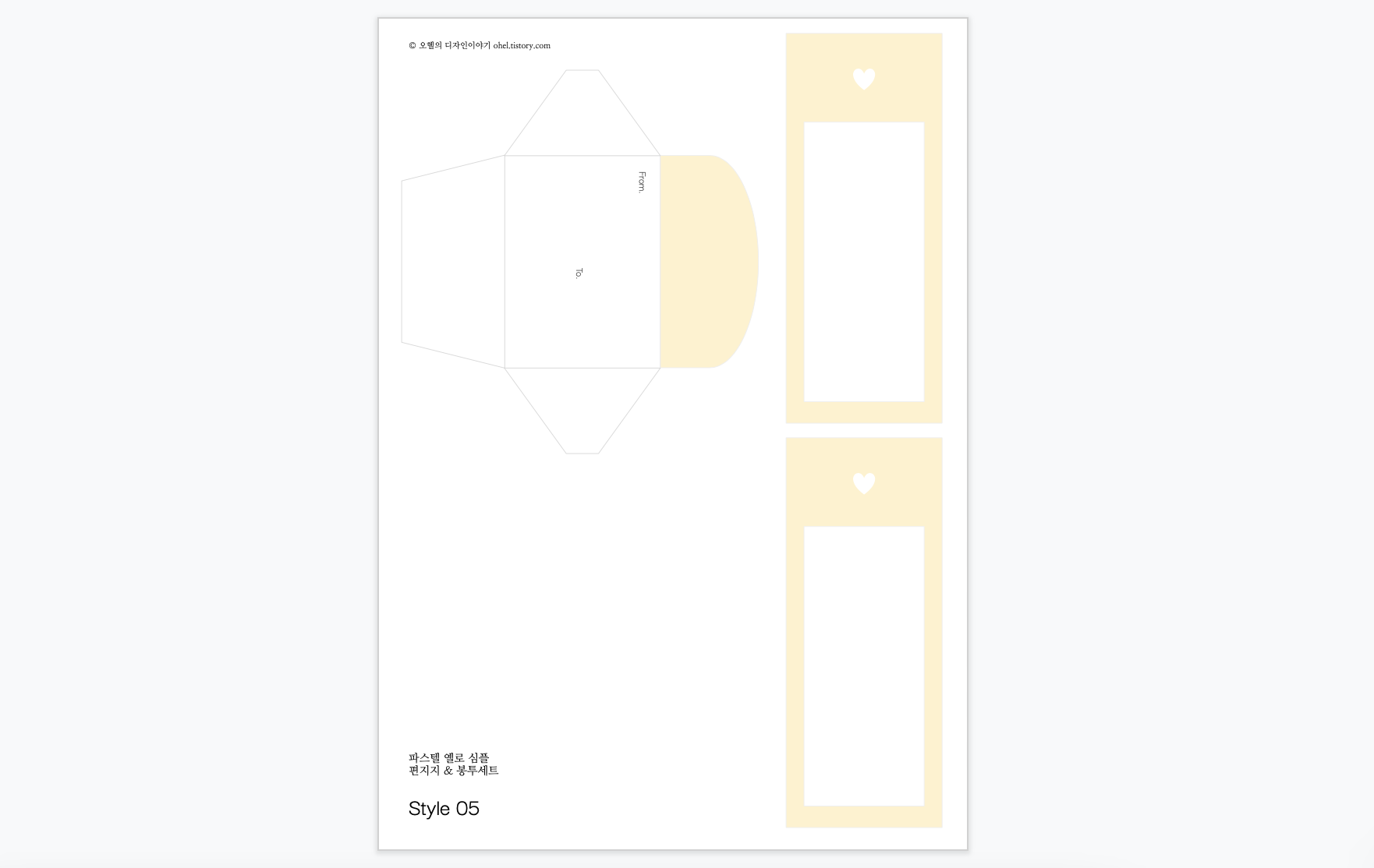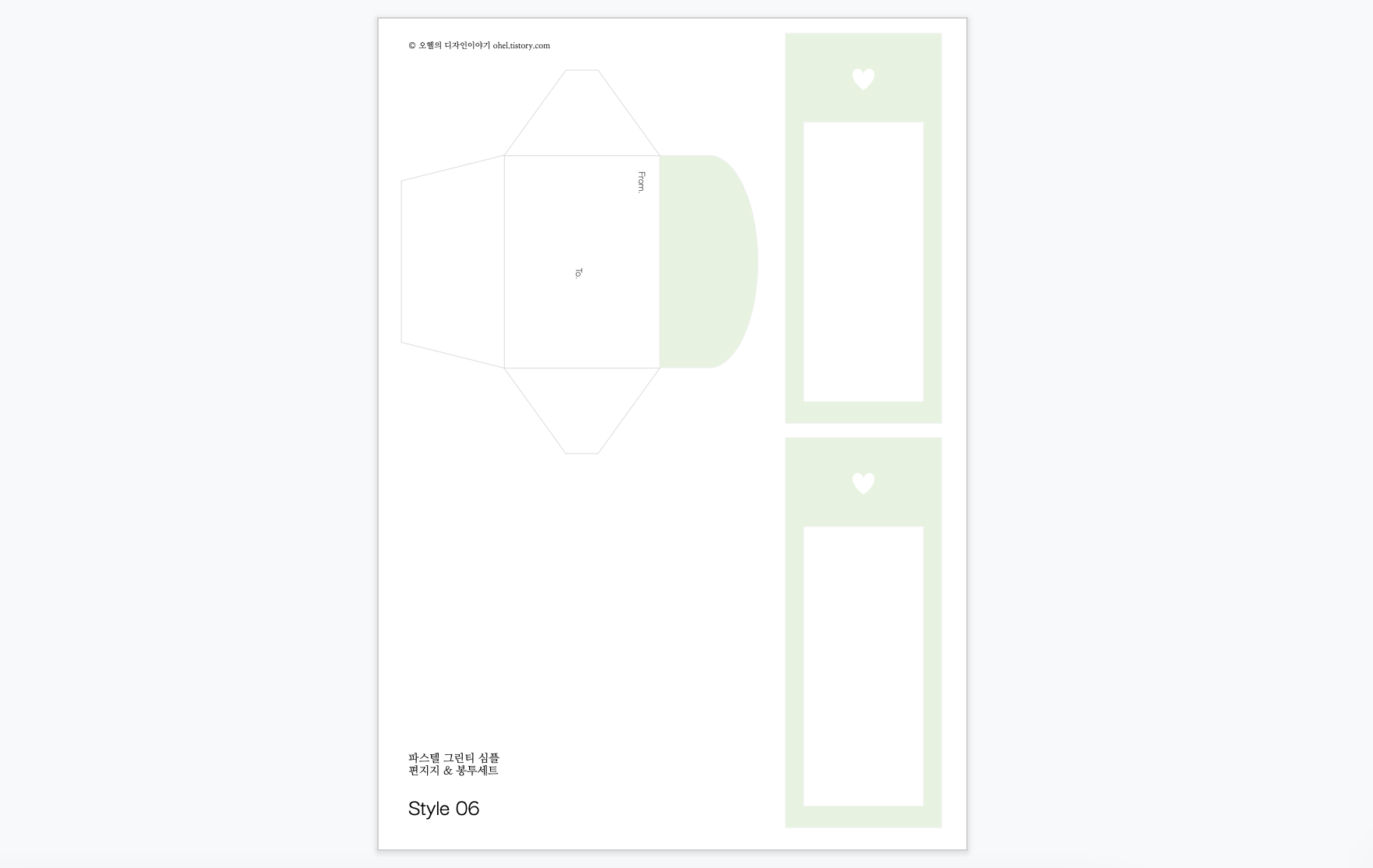 이렇게 작은 사이즈의 편지지와 봉투 도안을 이용하면 내용을 작게 적어도 좋고, 또 선물과 함께 넣을 때 쇼핑백에 들어가지 않을 염려도 없어 간편하게 사용하기 좋답니다. 색 조합을 다르게 해서 파스텔 심플 디자인으로만 7가지를 준비해 보았으니 요긴하게 사용해주세요!